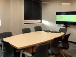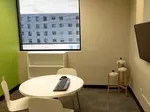 Small round meeting tables with basic white stackable chairs were perfect for the interview rooms. In the more formal conference room, we placed an 8-ft boat-shaped conference table with power outlets and data ports flush-mounted in the center of the table.