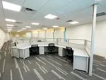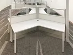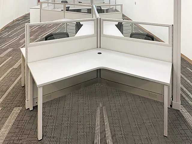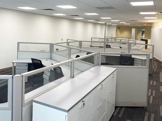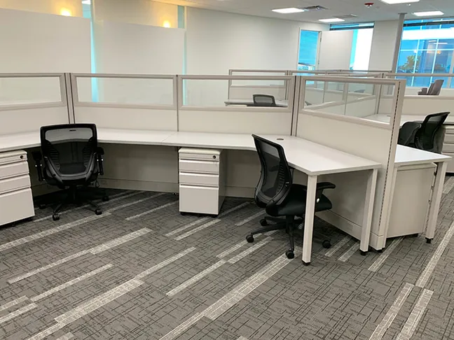Pictured here is the open office area where we had an ideal space for the popular “honeycomb office layout”. Our designers create this office floor plan using 120-degree V-shaped cubicle workstations, connected together in a rounded honeycomb-like pattern. As you can see in the 2D and 3D office layout, the arrangement followed the natural curves of the existing architectural walls for a seamless result.