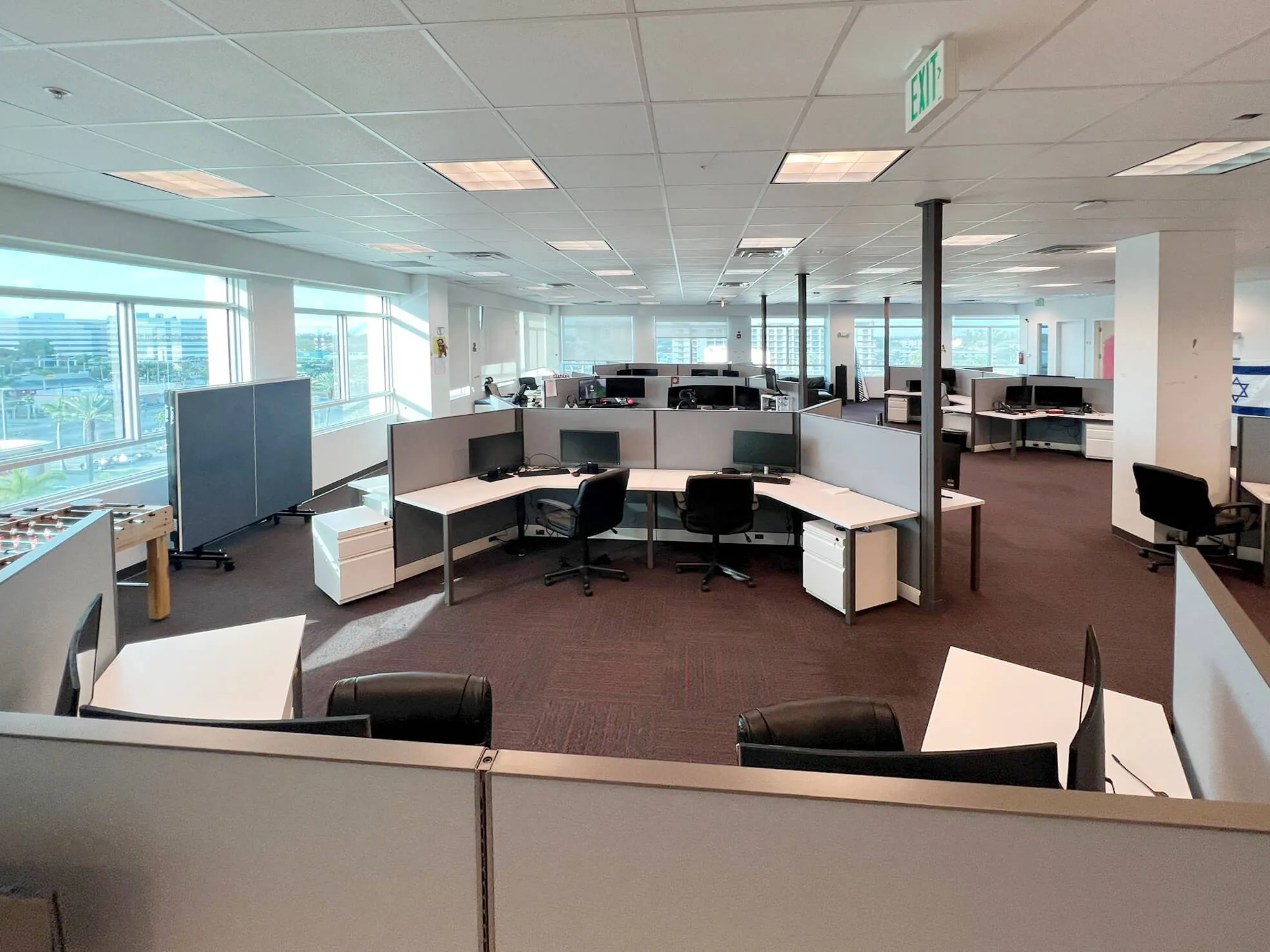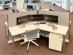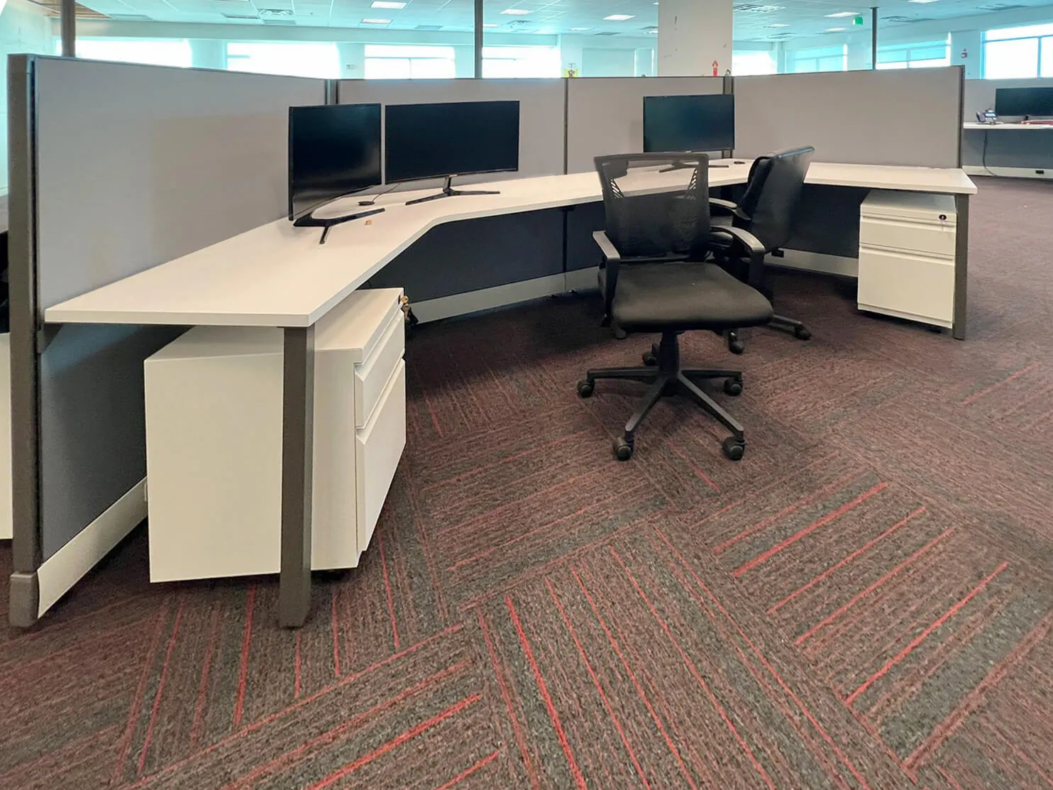 We then designed and installed 6 workstation clusters of 120-degree desks, totaling 36 new office benching stations.