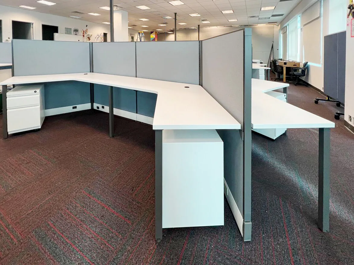 Each 4’x4’ powered angled desk in the aptly named dogbone workstation clusters was equipped with mobile pedestals offering convenient office storage for each user. The client opted for 53” high cubicle panels for flexibility was a key consideration, particularly regarding seating and accessibility. The finished layout fosters collaboration while maintaining individual functionality, creating a streamlined and highly efficient office environment. The result is a well-organized, aesthetically pleasing workspace that enhances team productivity and connectivity.