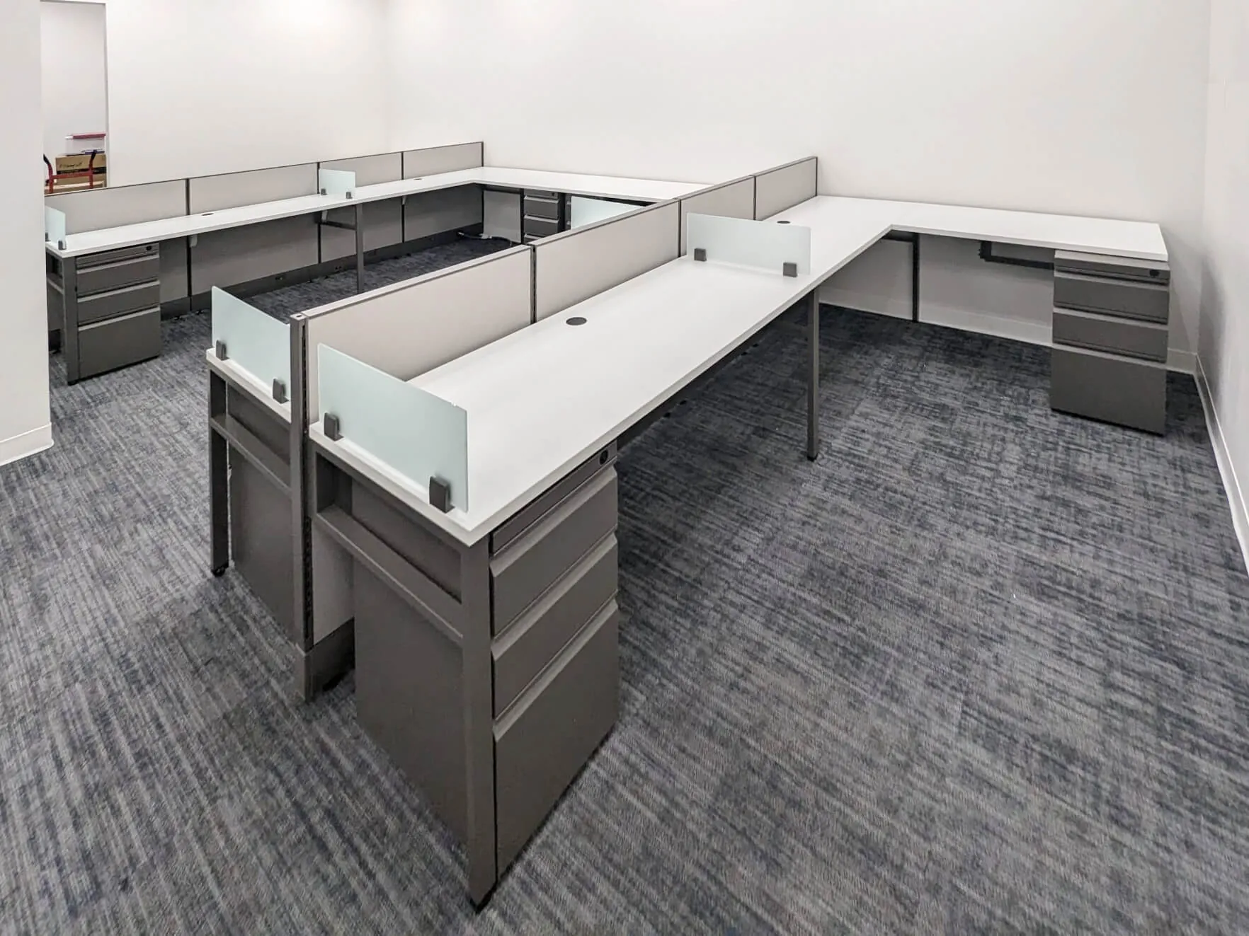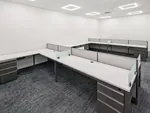 In the second area, which was an open office space, we installed twelve 5’ x 5’ x 39”H L-shaped cubicles, each complete with a box box file pedestal, ensuring ample storage and organization. The L-shaped desk design maximizes individual workspace while promoting a collaborative environment, offering a balance between privacy and openness in a shared office setting.