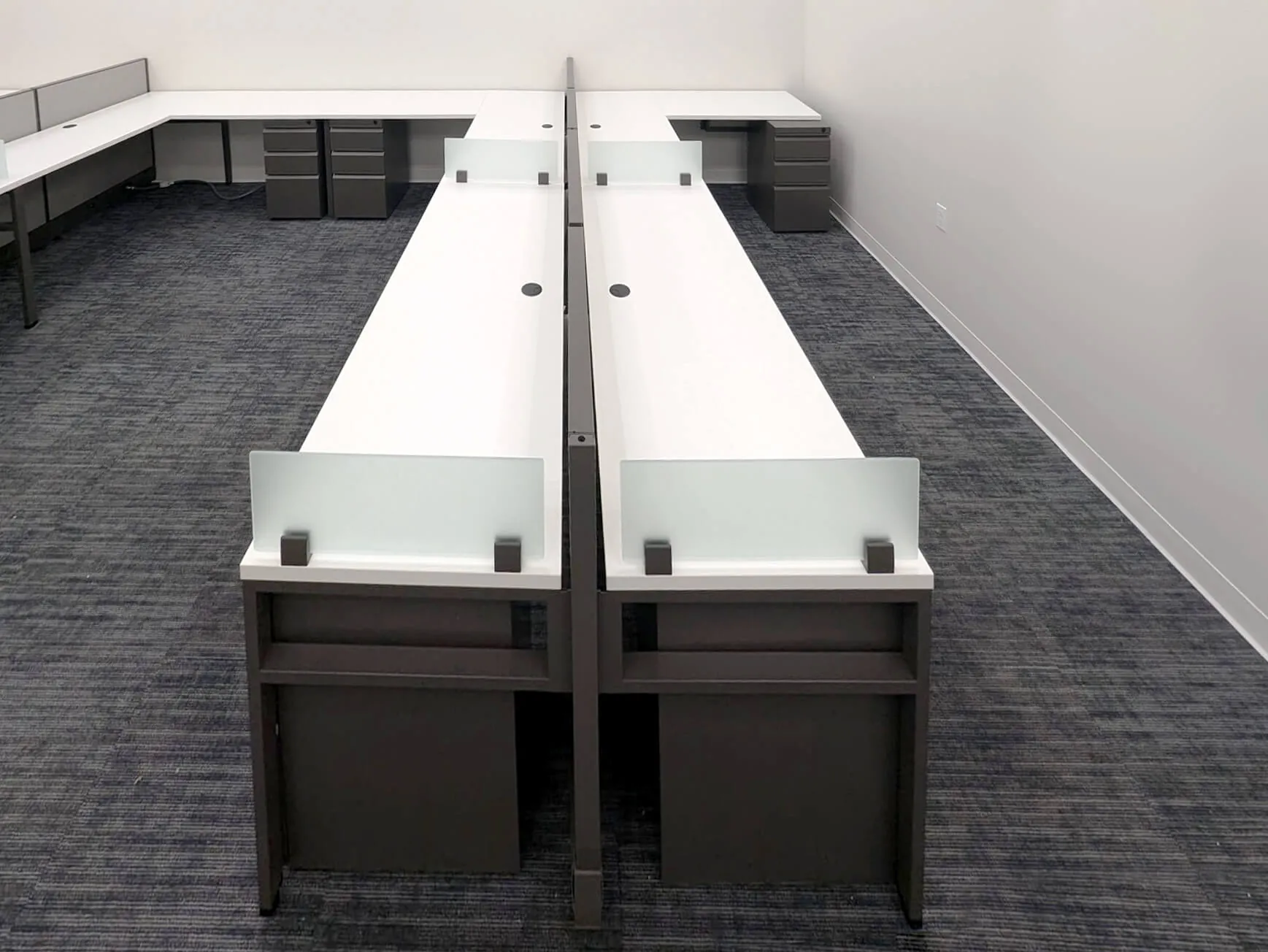 In the first area, we installed four 5’6” x 2’ x 39”H straight office desk setups and four 5’6” x 5’6” x 39”H L-shaped workstations. Each of these office stations were equipped with either a box box file pedestal, or a mobile pedestal version, for efficient storage. Each new workstation was also supplied with an 8” H frosted tempered glass desk divider for added privacy and to achieve a modern office look.