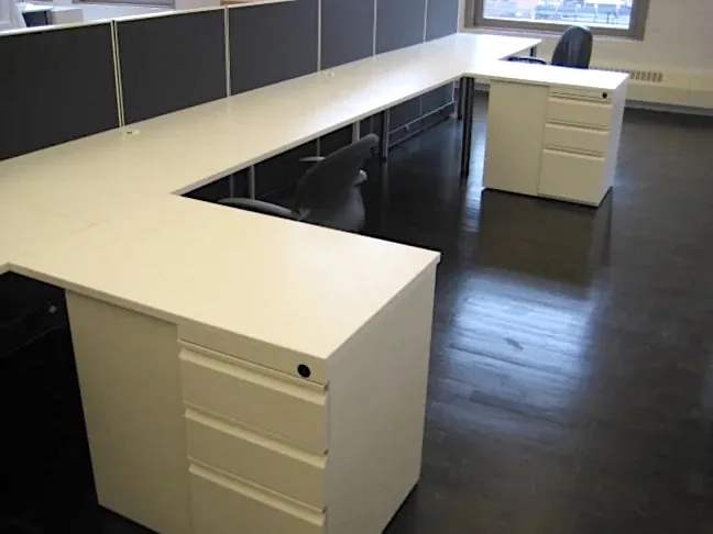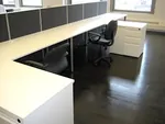 O2-NOW™ office benching desks meet all the requirements: practical, presentable, and price-conscious. 5.5’x5’ L-shaped workstations include shared desk returns and white metal filing cabinets under desk tops. 47”H cubicle walls provide a modicum of privacy between employees facing one another, and also enclose the electrical and data cables routing to each station.