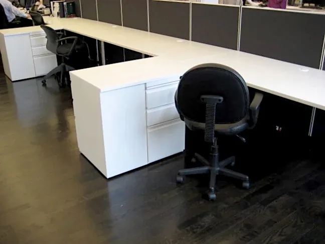 White workstation desks starkly contract the dark grey cubicle panels and dark wood office flooring, brightening up the otherwise relatively dark open plan office.