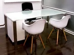 We specified a modern tempered glass office desk with pedestal for the manager’s office. For visitor seating, white guest chairs with wooden legs look incredibly similar to the very famous Herman Miller Eames molded chairs but come at a fraction of the price.