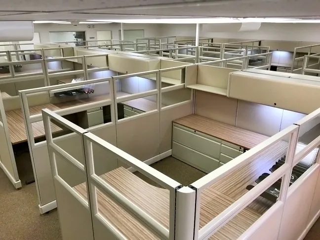 We fully wrapped every desk station with 67” high cubicle walls, with just a narrow entry to each work area. But the top half of all desk partitions are clear glass, so everyone can still smile at their neighbor.