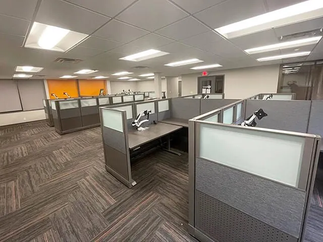 4 L shaped cubicles with adjustable sit and stand desks makes focus work a little easier when users can transition from a seated to standing position, with the touch of a button. Each sit and stand desktop were provided with a dual monitor arm and a box/box/file pedestal for storage.