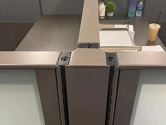 The client was exceptionally drawn to the rich materiality and aesthetic of our O2™ Razor Tile System. For the workstation area our office space planners utilized this system to configure 10 L shaped cubicles with sit and stand desks, each with a height adjustable base and dual monitor arms. These cubicle workstations comprise of a combination of glass cubicle panels, perforated metal, and fabric office panels. This amalgamation of materials and textures provides each sit and stand workstation with a contemporary office look that the client was aiming to achieve.