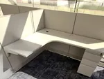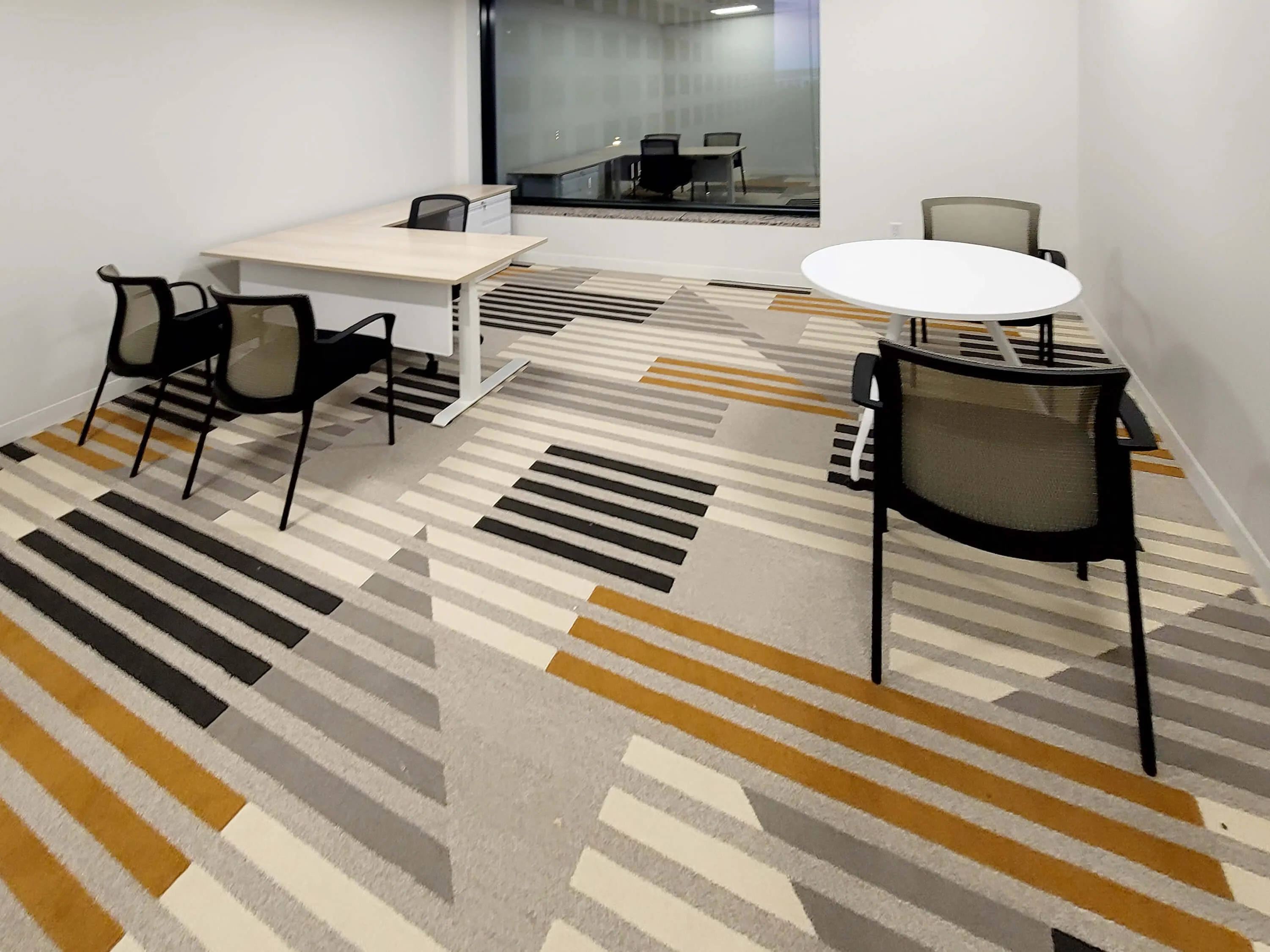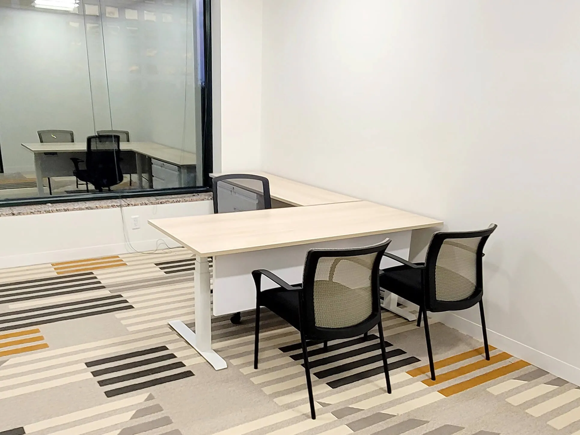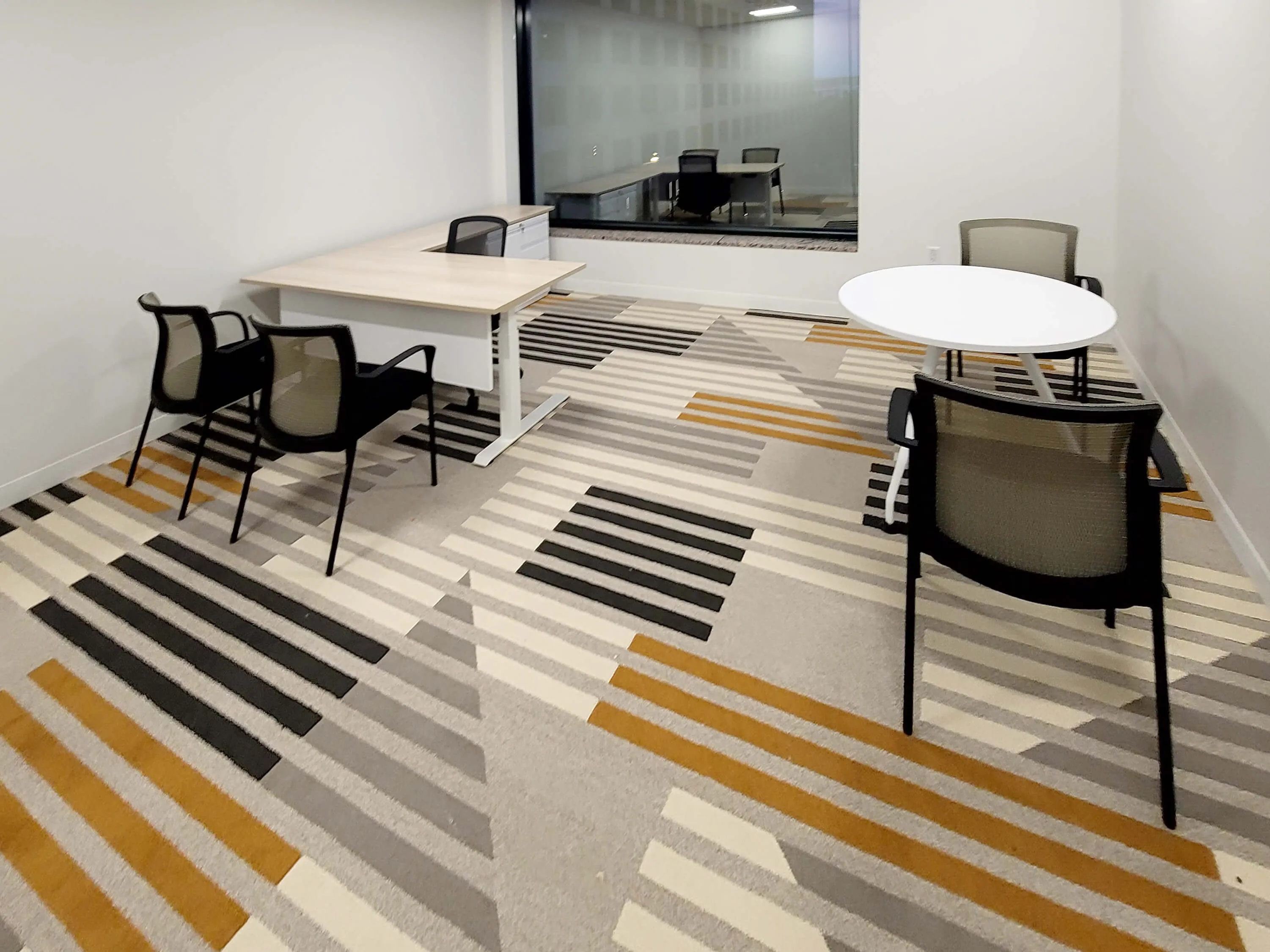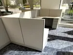 In the executive office suites, four 6’W x 7’-6”D L-shaped workstations were installed. Each suite is outfitted with a height-adjustable desk, an office storage unit, and a desk modesty panel for a refined professional setting. Offices #2 and #3 also include 36” diameter round office tables to support small meetings or personal work sessions.