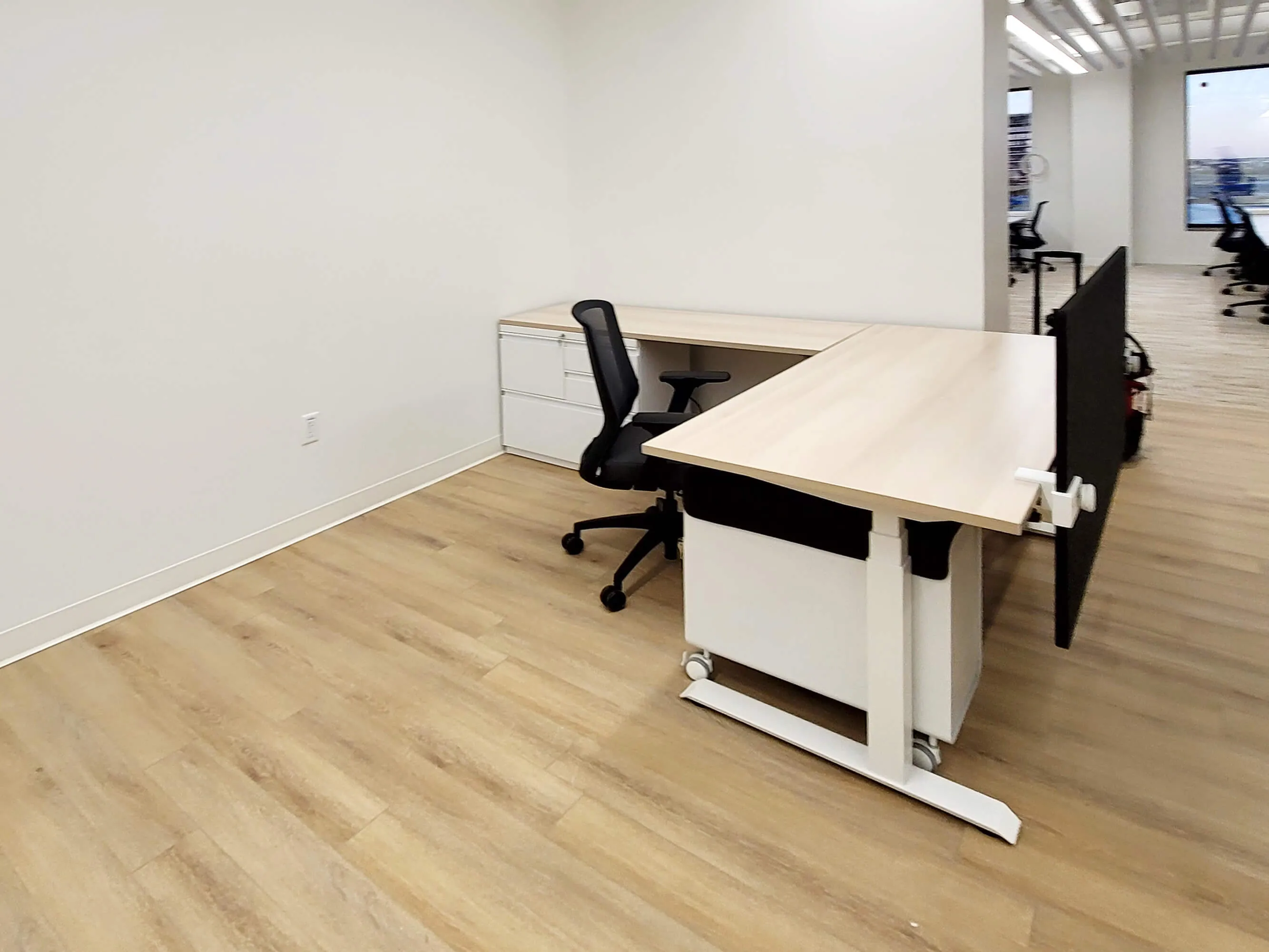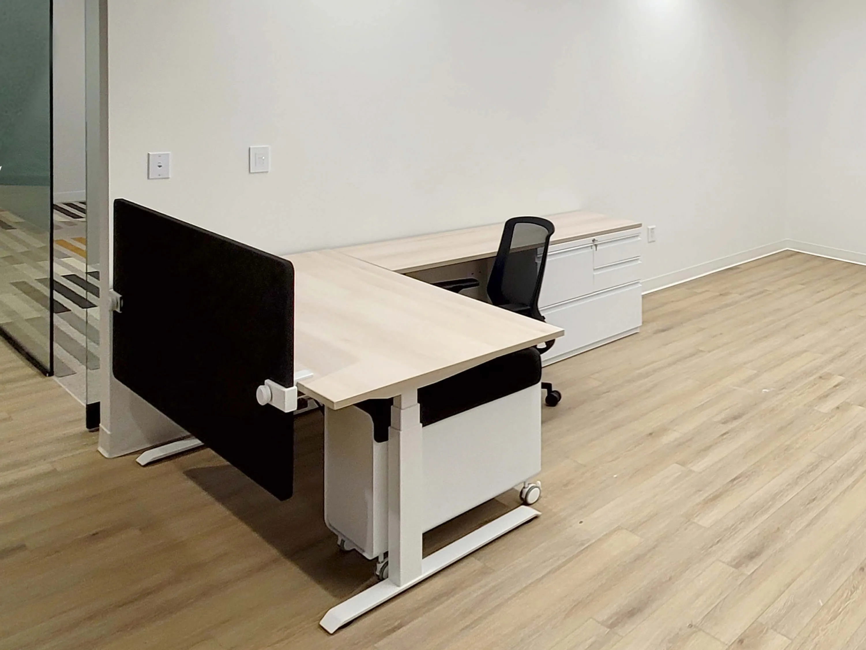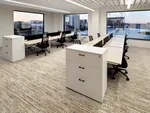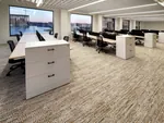 The open area was thougtfully designed with flexibility and efficiency in mind, featuring ten powered L-shaped workstations—two 6’x6’x47”H and eight 6’x5’x47”H stations, each equipped with a box box file pedestal for convenient storage. These workstations foster teamwork while maintaining individual workspace boundaries.
