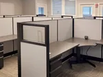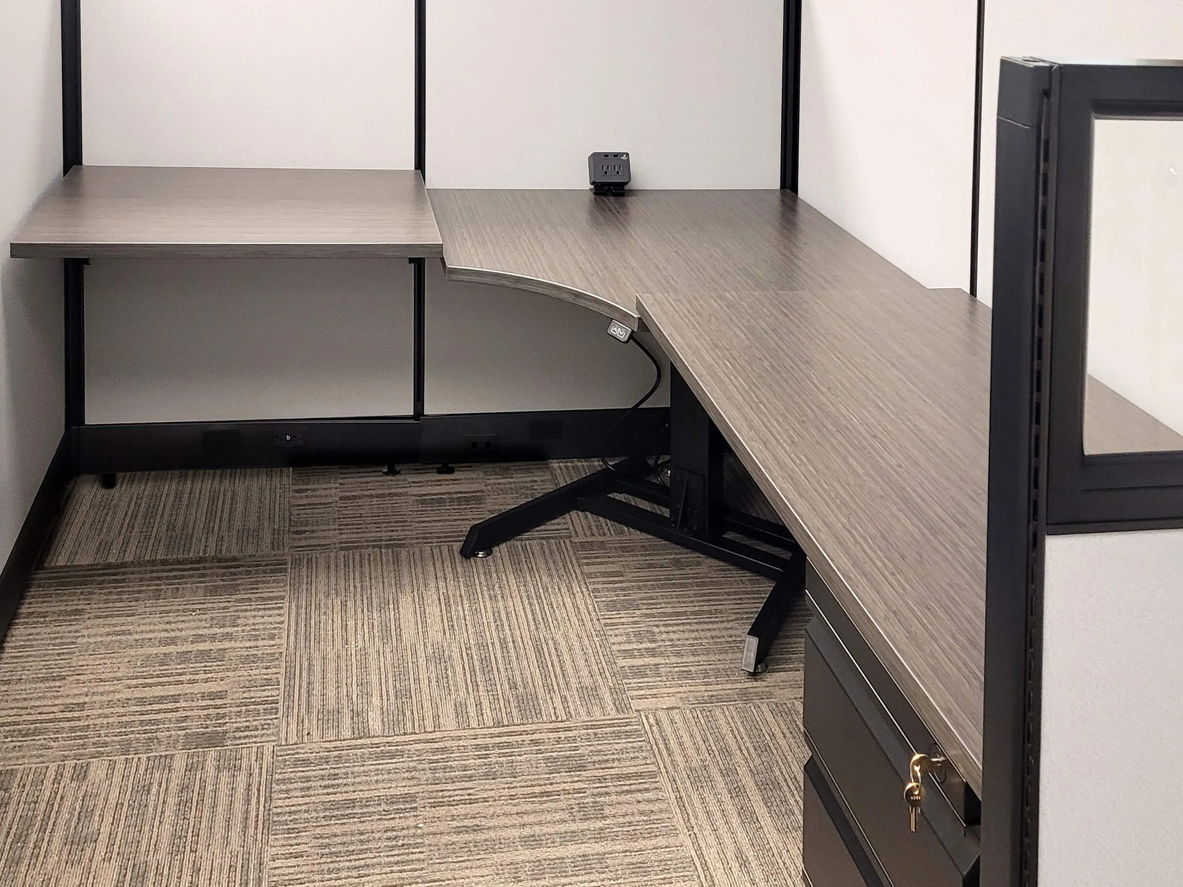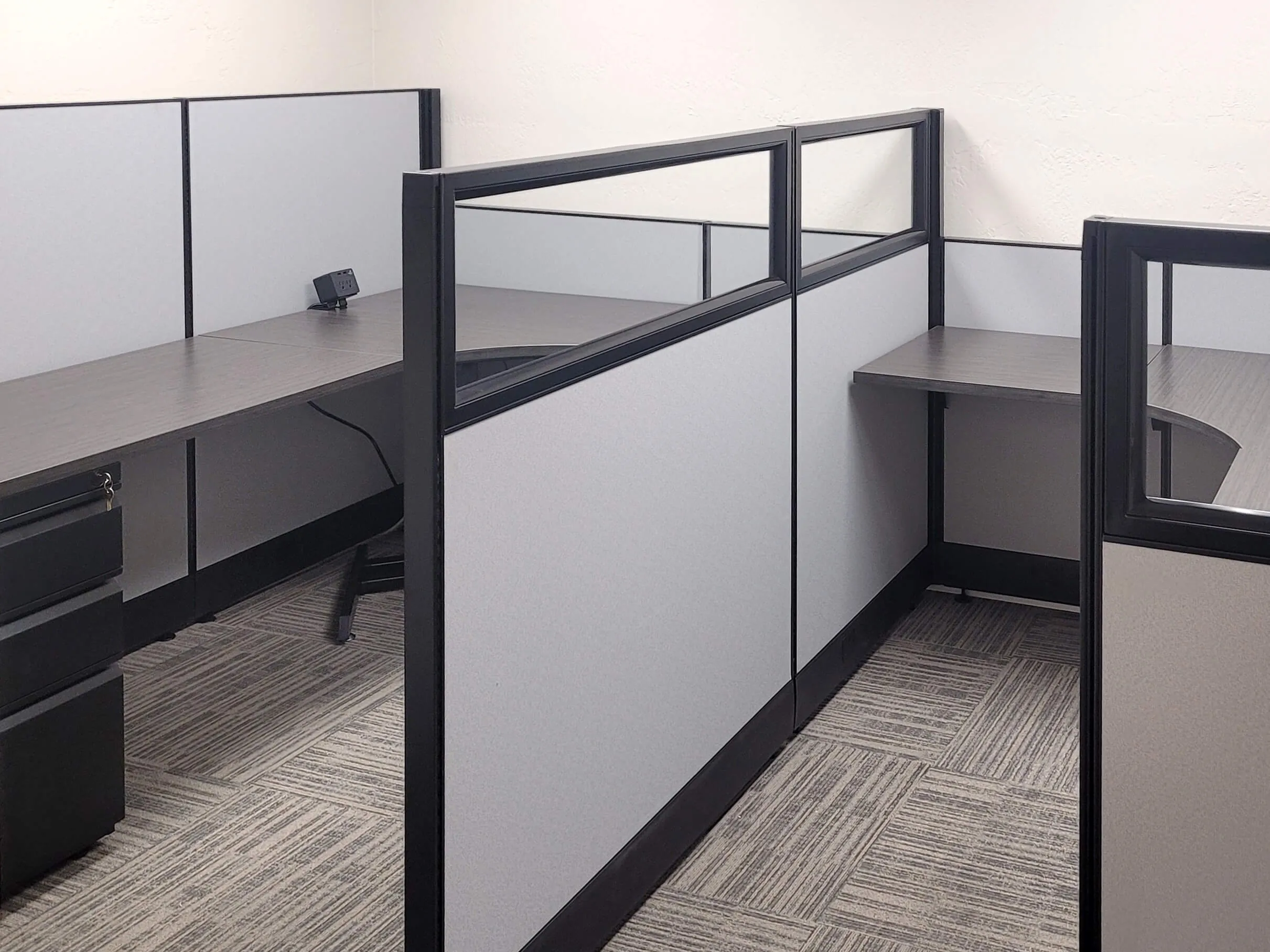 To create an efficient workspace for their marketing team, we installed black and grey cubicles featuring cubicles with glass panels. In the marketing office, we implemented two L-shaped modern cubicle furniture workstations, while the open office space was furnished with six similar workstations. Each cubicle included a height adjustable desk corner unit and a sleek black desk pedestal for storage, enhancing both functionality and comfort in the open office space.