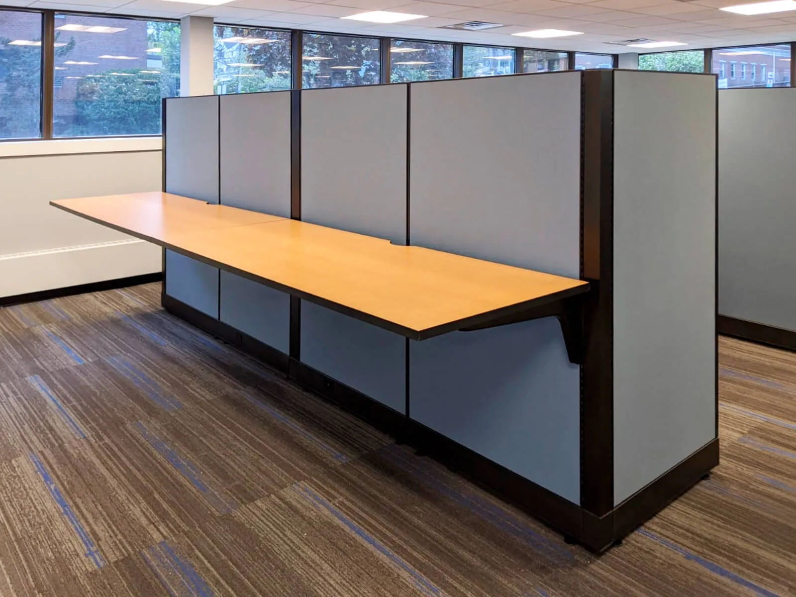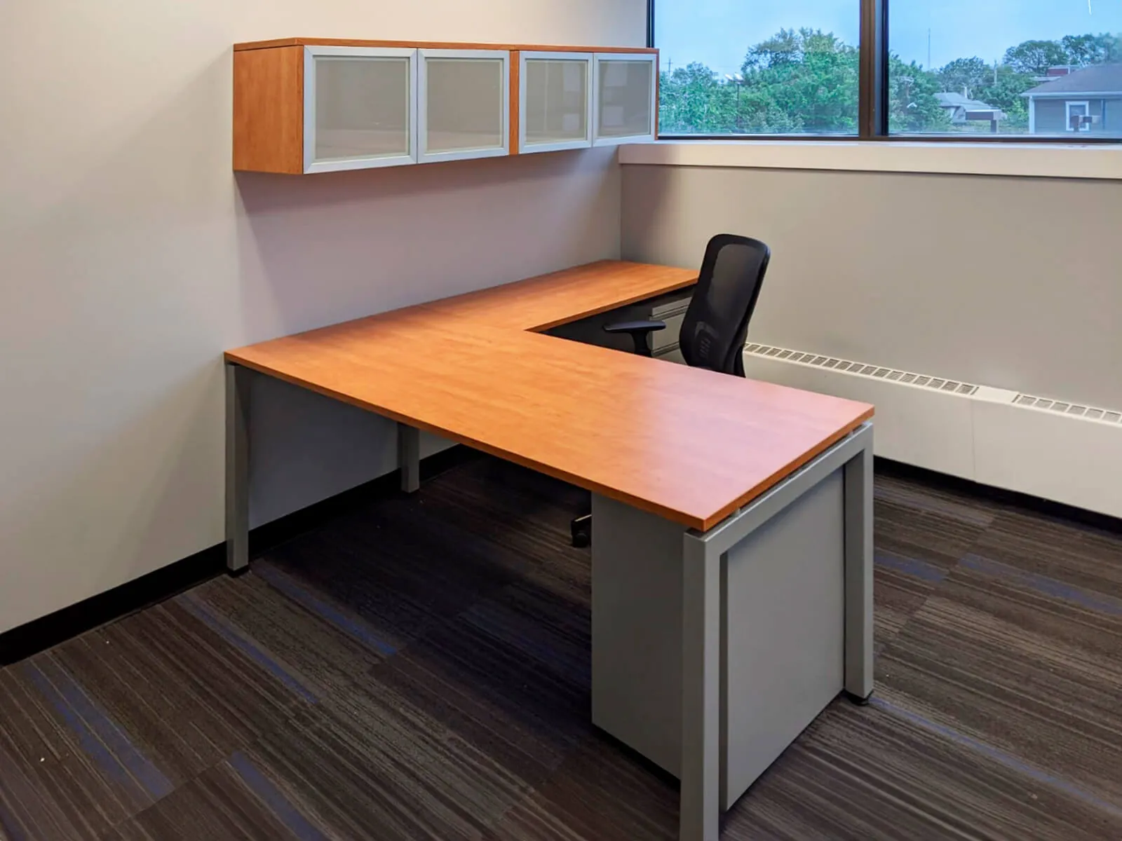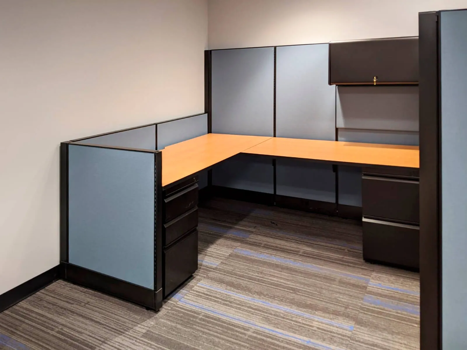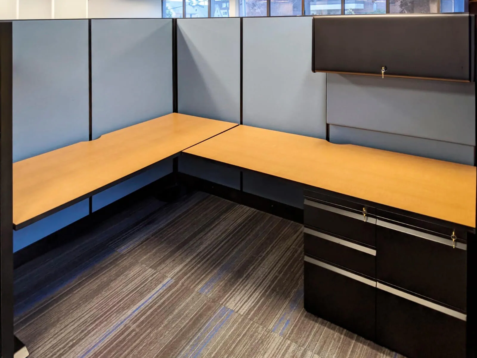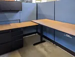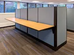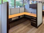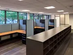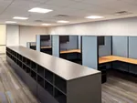 In the open office area, we setup up six office cubicle desks with L shaped electric sit and stand desks and comfortable black task chairs. Adjustable height desks provide users the option of a seated or standing desk position, with the simple touch of a button. As a standard office storage solution, each workstation office desk was also equipped with an overhead unit and an office pedestal.