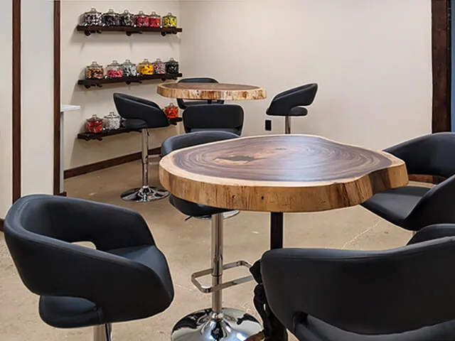 For the canteen we custom designed a slightly taller office bar height table that is anything but ordinary. Thick tree trunk slices were used to create custom live edge tabletops, introducing a tangible bit of nature to the interior. Combined with contemporary mid back office chairs, this unique office canteen is a great space to relax and unwind.