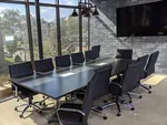 Subdued hues were specified in the conference room, so as not to detract from the articulated view of lush greenery, that forms the perfect backdrop for lengthy meetings. The sleek graphite wooden conference room table was matched with 12 of our high end office chairs in black to complement the existing grey brick wall.