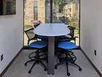 In the huddle room an office height table and drafting office chairs transform this space into an informal, modern meeting room. A dash of color on the blue office chairs is a welcome break from the otherwise neutral office color palette.