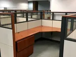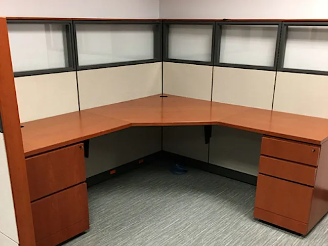 With the combination of glass tiles, neutral fabric, and rich cherry wood, cubicles like these are a timeless classic. Each 7.5’x6’ L-shaped workstation includes wood cubicle storage cabinets – one 2 drawer lateral file and one “box box file” pedestal.