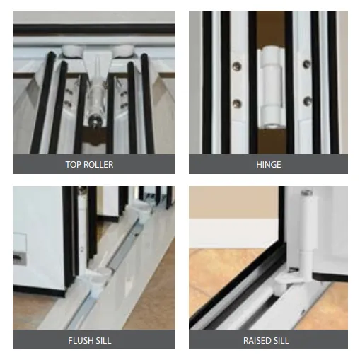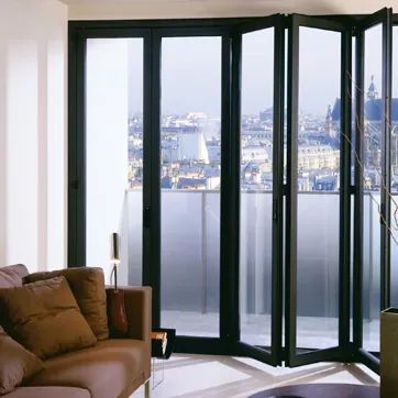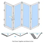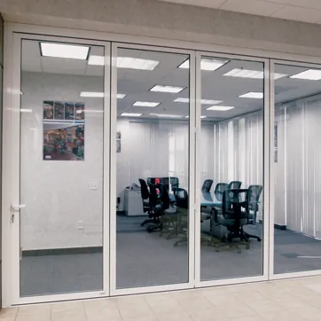 Aluminum framed sliding/folding glass wall system, including frame, threshold, panels, sliding/folding and locking hardware, weather stripping, glass and glazing. Designed to provide an operable glass wall, with sizes and configurations as shown on drawings.