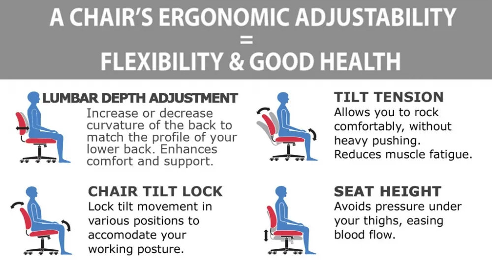 Adjustable ergonomic chair features that can encourage health and wellness in the workplace: Built-In Lumbar Support, Tilt Lock Mechanism, Tilt Tension Adjustment Knob, Swivel Seat, Pneumatic Seat Height Adjustment - making this a comfortable office chair that will support you during long days at the office.