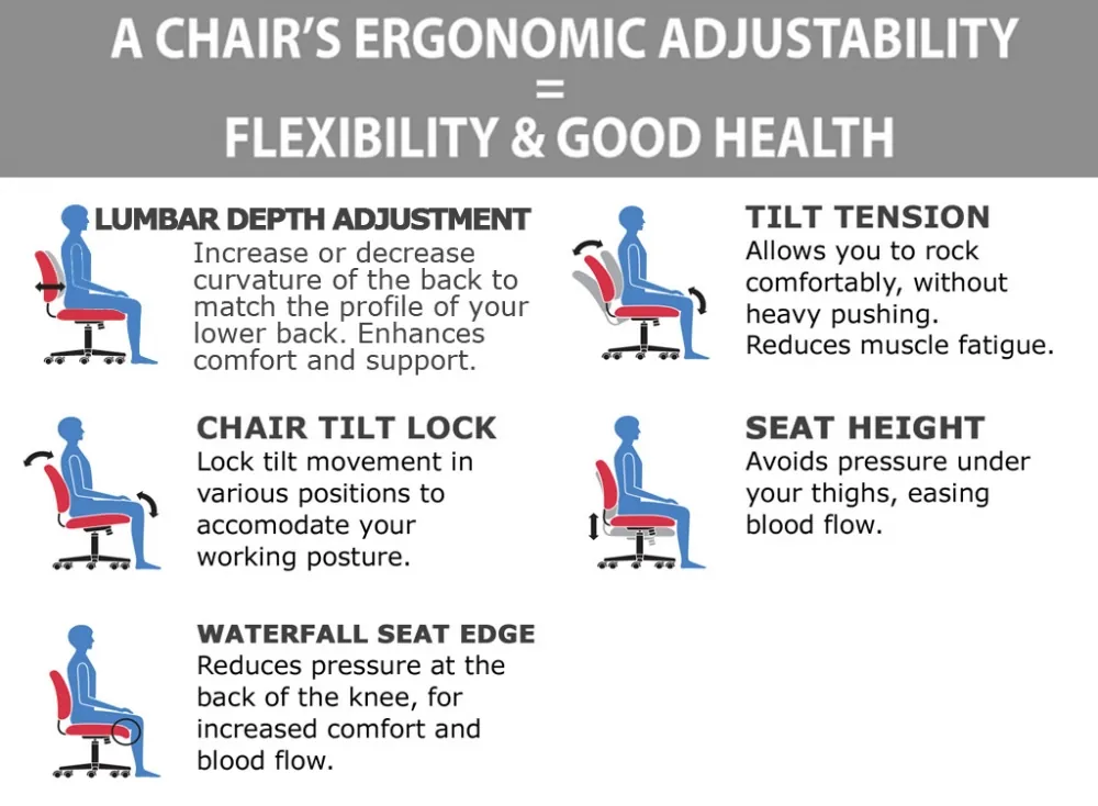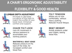 Adjustable ergonomic chair features that can encourage health and wellness in the workplace: lumber depth adjustment, tilt tension, chair tilt lock, seat height, waterfall seat edge.