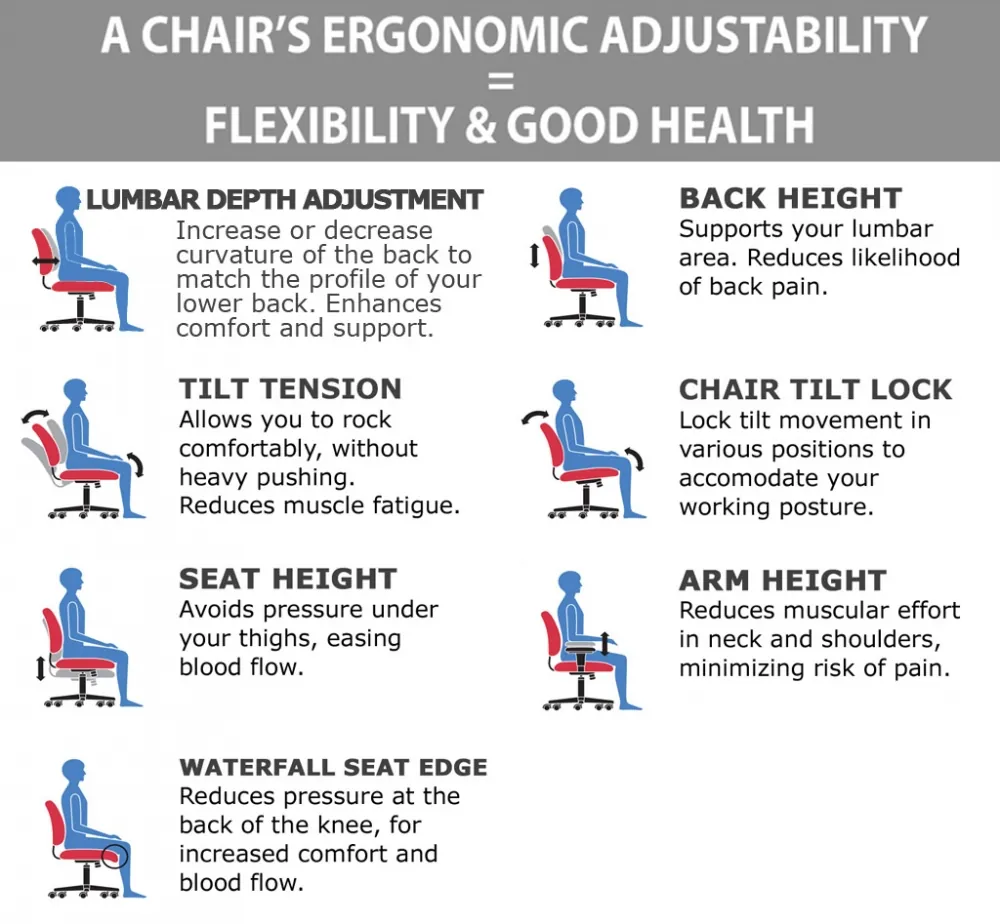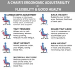 Adjustable ergonomic chair features that can encourage health and wellness in the workplace: lumber depth adjustment, back height, tilt tension, chair tilt lock, seat height, arm heght, waterfall seat edge.
