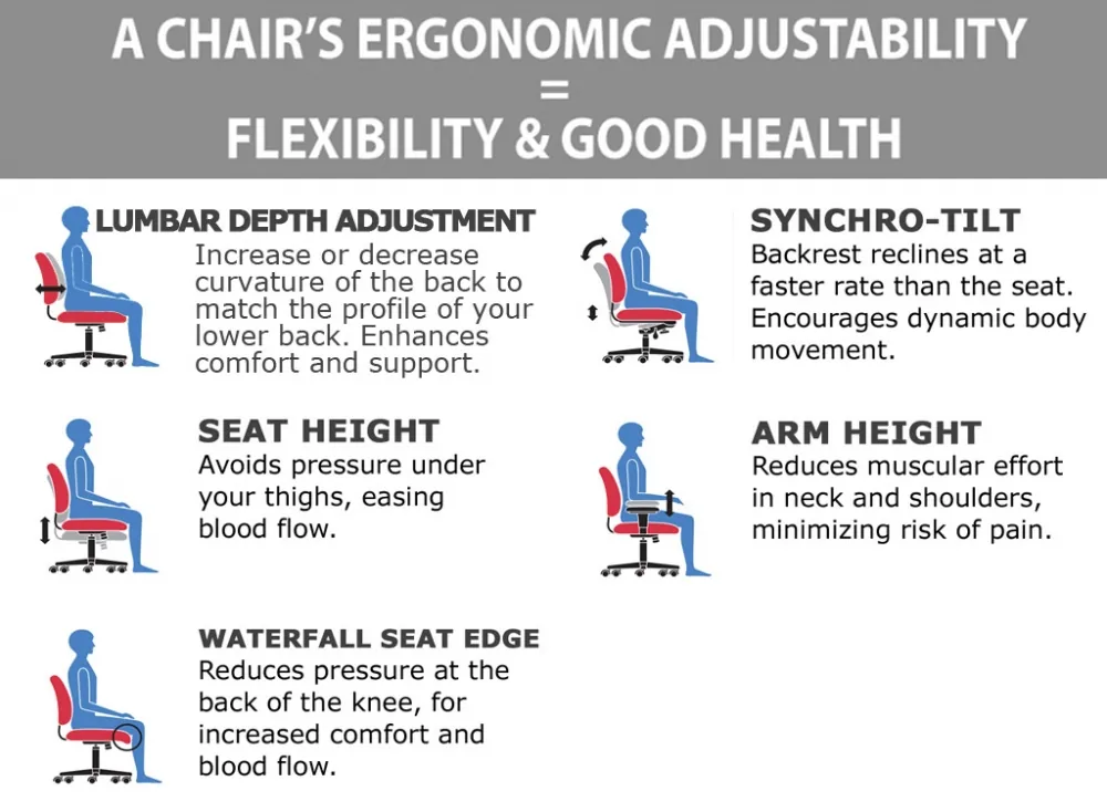 Adjustable ergonomic chair features that can encourage health and wellness in the workplace: lumber depth adjustment, synchro-tilt, seat height, arm height, waterfall seat edge.