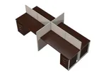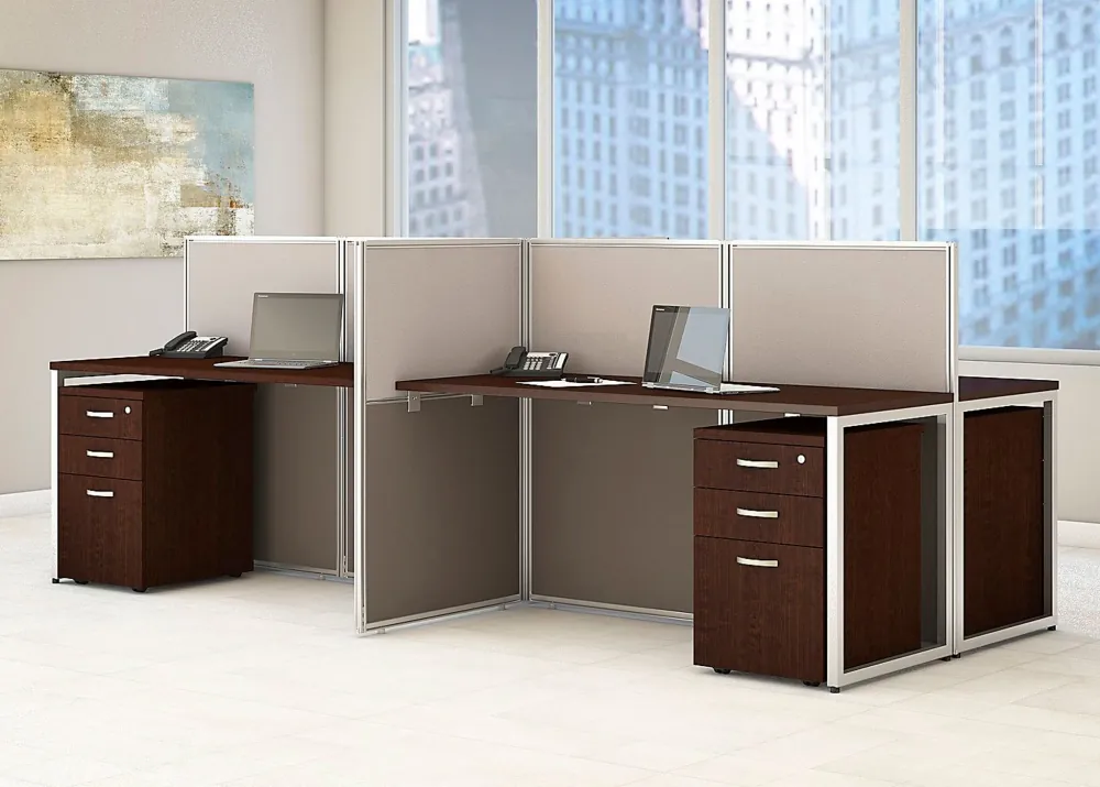The ideal collaborative workspace should be attractive, efficient, and affordable. EZ Office saves you space, time and money with in stock workstations that ship fast and assemble easily. This preconfigured unit combines 4 separate desk areas attached to 45"H wall panels that define individual space without preventing interaction. They include four matching 3 drawer mobile filing pedestals on casters that slide under the desk. This simple and sturdy design provides an uncomplicated approach to office furniture.