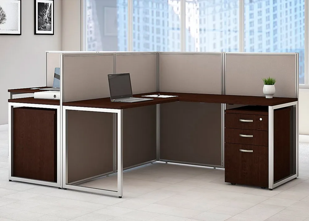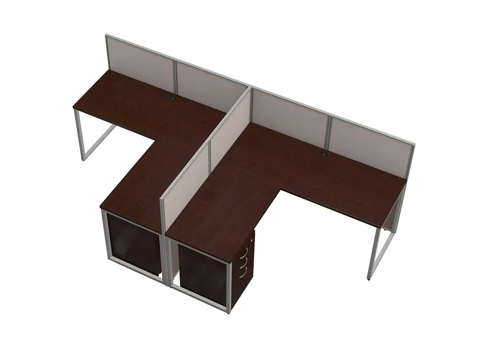 Work together with workstation desks for two! EZ Office is a simple and creative way to arrange your office space for effective collaborative co-working. Two L shaped cubicle desks face each other with shared dividing panels and include matching 3 drawer mobile file pedestals, which slide under the desks to save space. This is a great way to go if you like to save time, money and hassle.