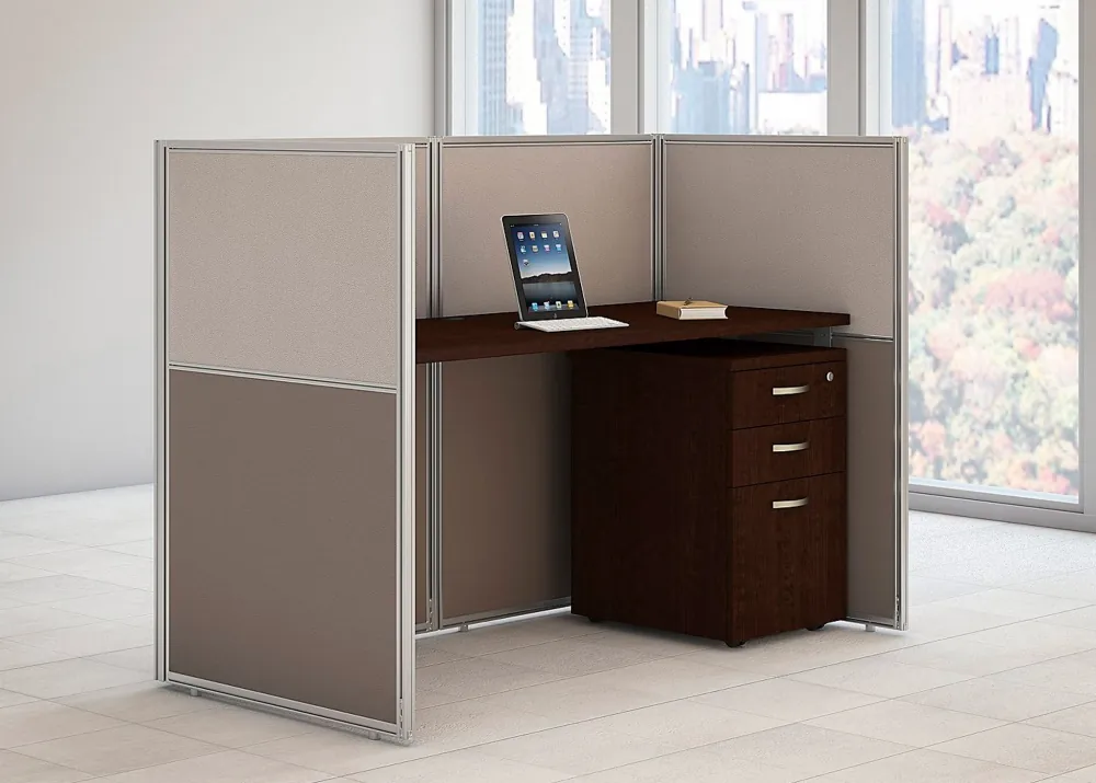 EZ Office workstation furniture is a simple and smart office solution with everything you need and nothing you don't. This straight desk is surrounded by 45"H panels on all three sides - which is tall enough to offer moderate privacy and hide desktop clutter, and low enough to encourage eye to eye interactions while seated and working. This is a ready to assemble product that ships quickly and fits well in open office environments.