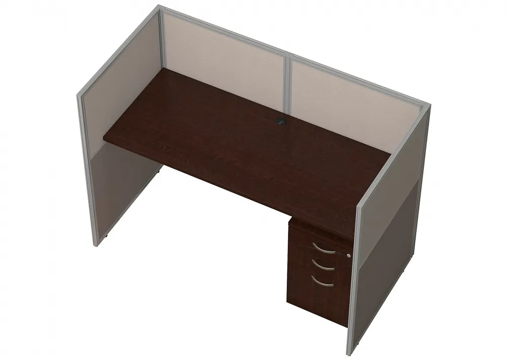 This work cubicle is available with silver metal accents, a Dark Mocha Cherry laminate desktop, and two-tone fabric panels (Light Gray / Storm Gray).