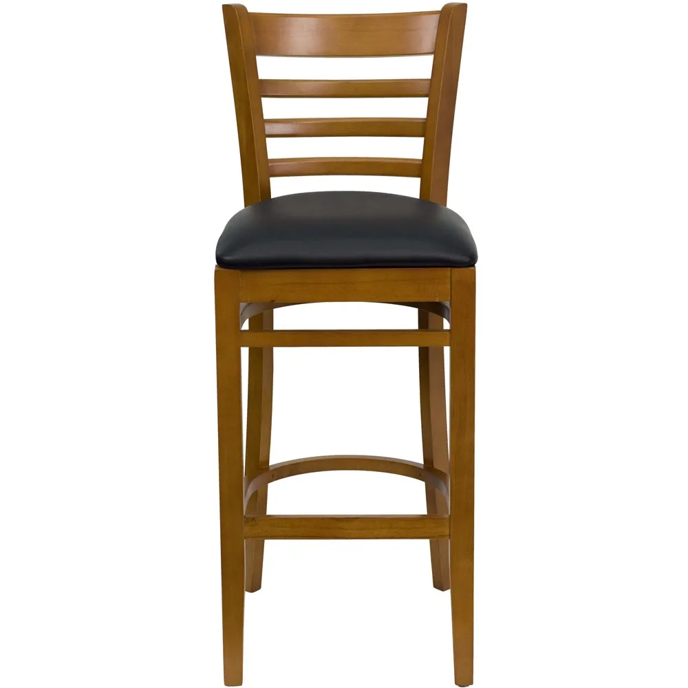 Strong enough for a restaurant, but priced for a house. Strut your vintage style with "Wedge'' traditional bar stools featuring a classic wooden ladder back, padded seat and full surround foot rest bars. These classic wood stools are the perfect complement to traditionally styled restaurants, bars, or home entertainment areas that already have wooden interiors and vintage brass and stained glass accents - you can just picture it!