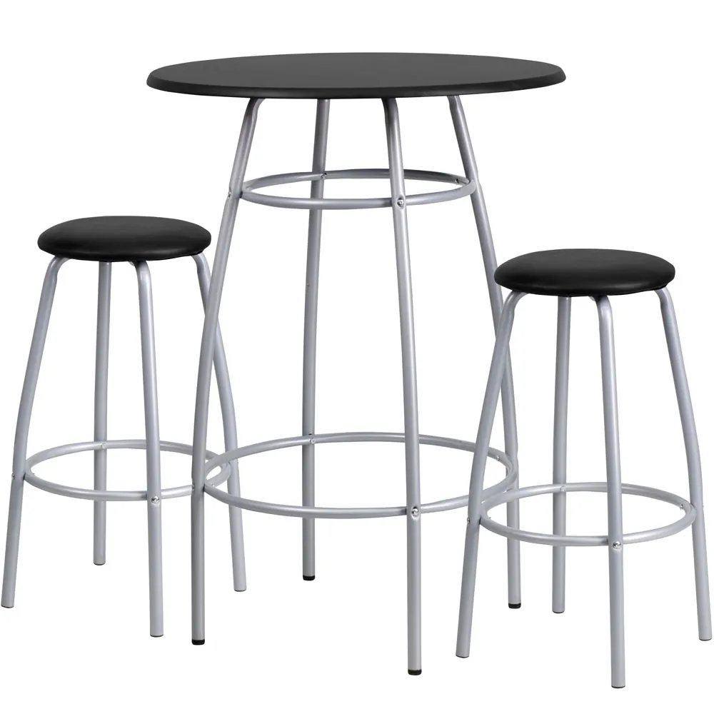 This high top table set includes chairs and a table with matching silver powder coated frame designs. The black tabletop matches the black padded vinyl seats.