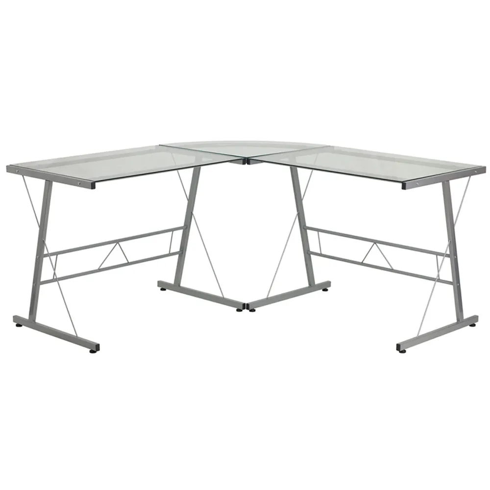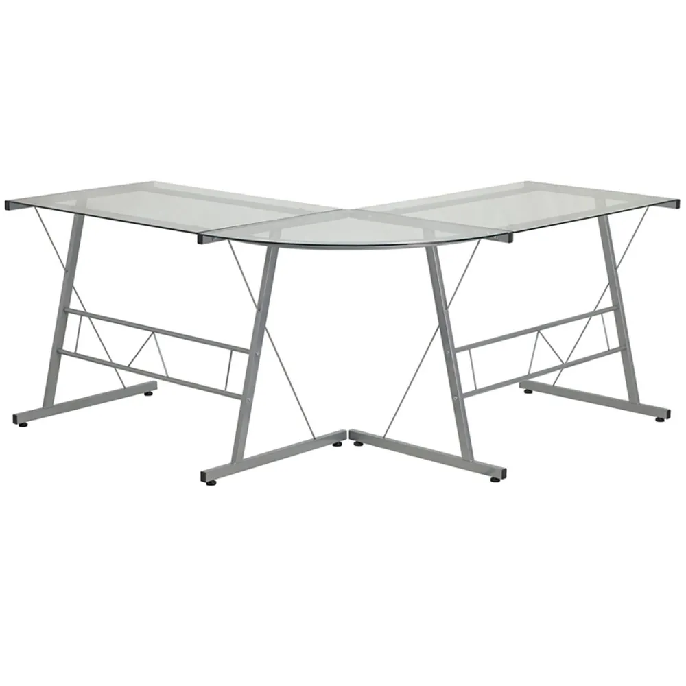 With a clear tempered glass top and silver frame, this glass L shaped desk defines your space with elegance and efficiency. Flavia is a great choice for any office space, and comes at a very affordable price, is in stock, and ships direct to your door in under a week! What's not to love.