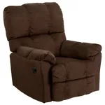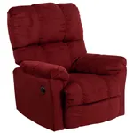 This modern recliner chair has steel and wood construction. It has microfiber upholstery, plush upholstered arms and dacron wrapped 1.8 resiliency foam (CA117 fire retardant). Spot clean with damp cloth. The recliners are available in three color variations: Top Hat Berry (Red), Top Hat Chocolate (Brown) and Top Hat Coffee (Brown).