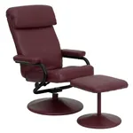 This swivel recliner has a metal frame, plush upholstered arms, and LeatherSoft (leather & polyurethane) upholstery for added softness and durabilty. CA117 fire retardant foam stuffing. The recliner is available in five colors: Black, Brown, Burgundy, Cream and Palimino.