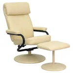 This is a knob adjusting recliner with a pillow top headrest, swivel seat and leather wrapped bases (recliner and ottoman). Spot clean with damp cloth.
