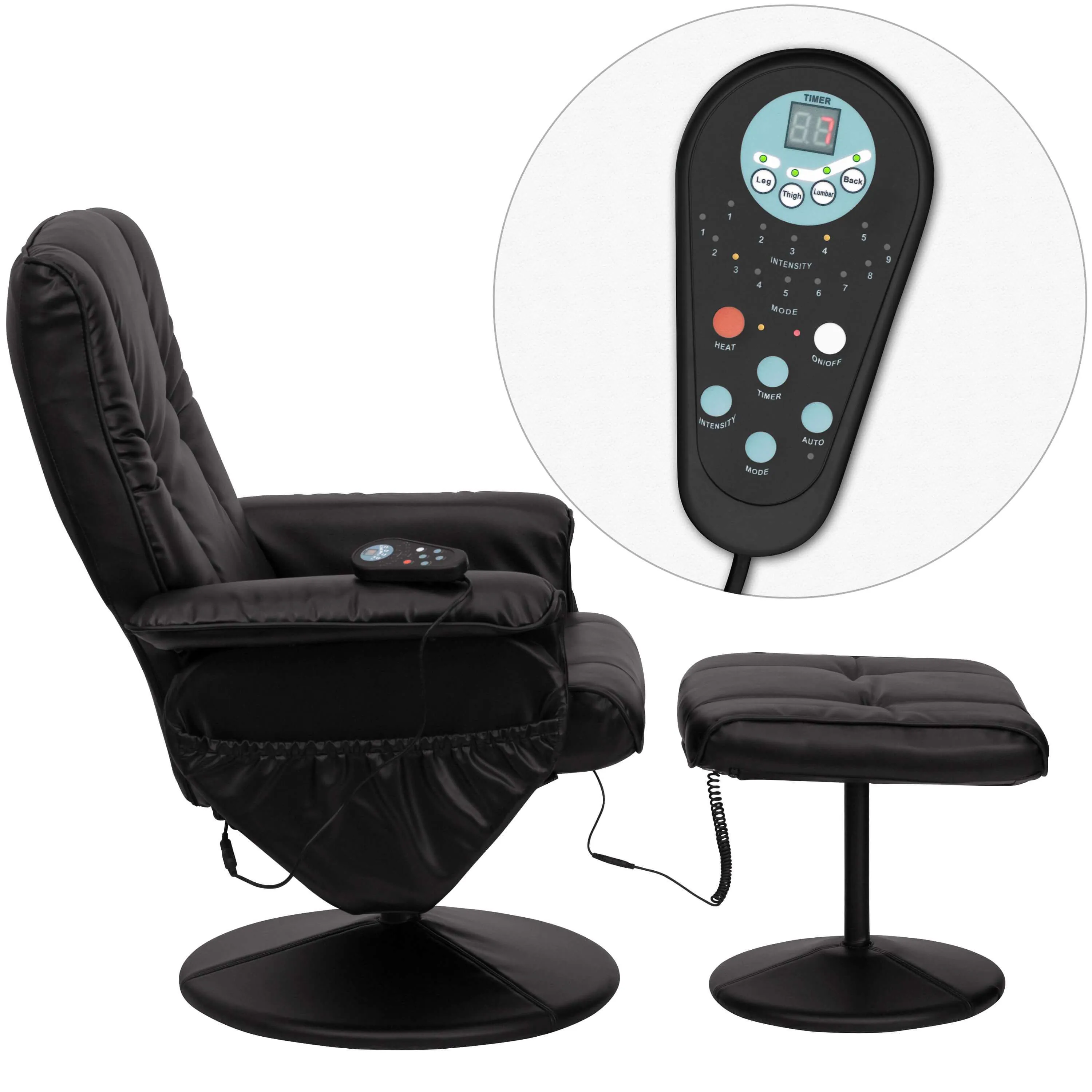 This is a knob adjusting massage recliner with deep side pockets, swivel seat and leather wrapped bases (recliner and ottoman). Remote Functions include: Controls on Recliner and Ottoman; On/Off Control; Auto Control; Timer Control; Heat Control; 9 Massage Modes; 5 Intensity Levels; Massages Back, Lumbar, Thighs and Legs.