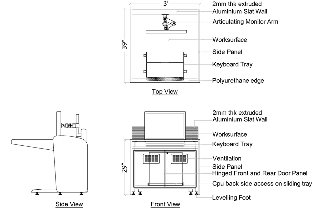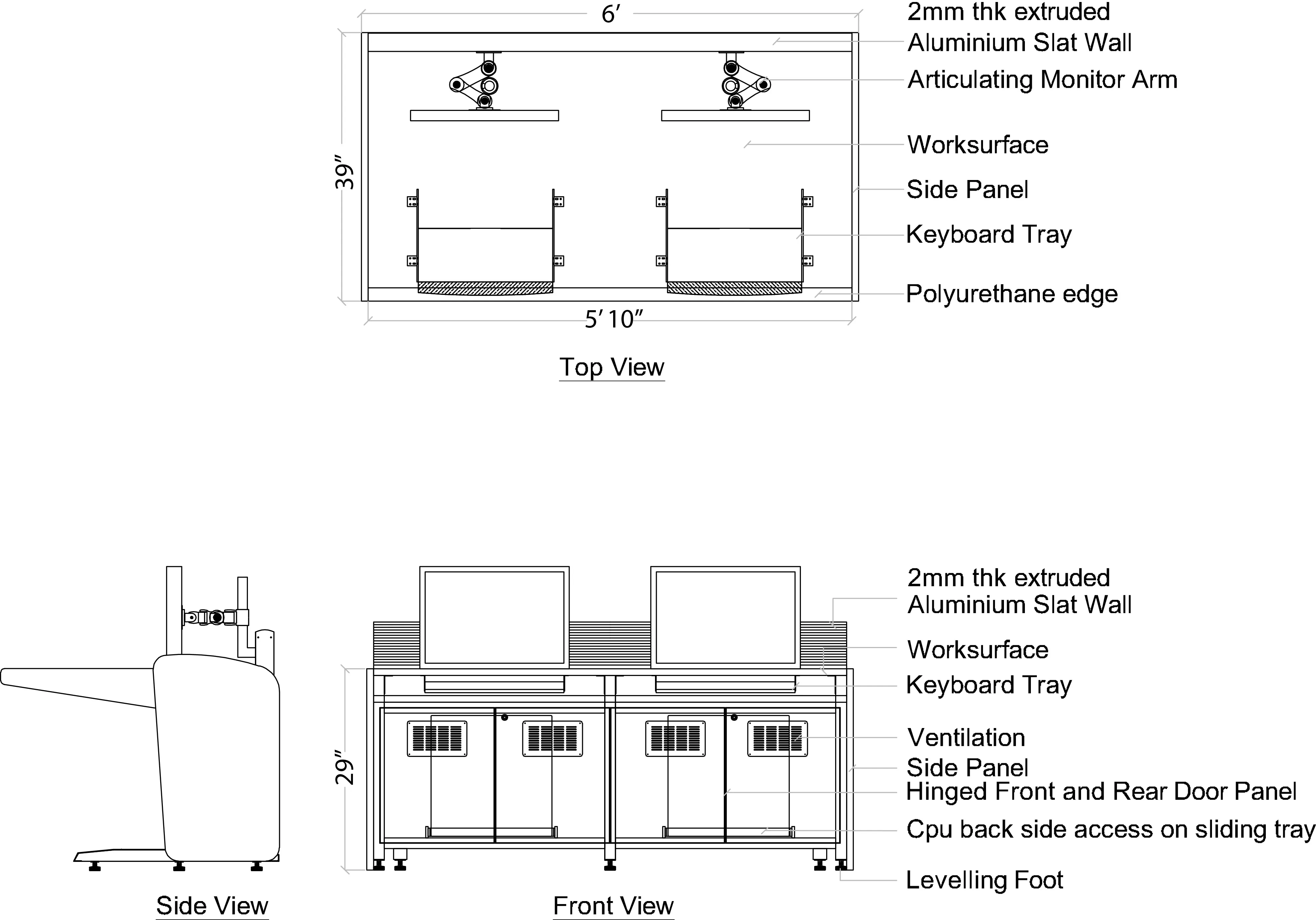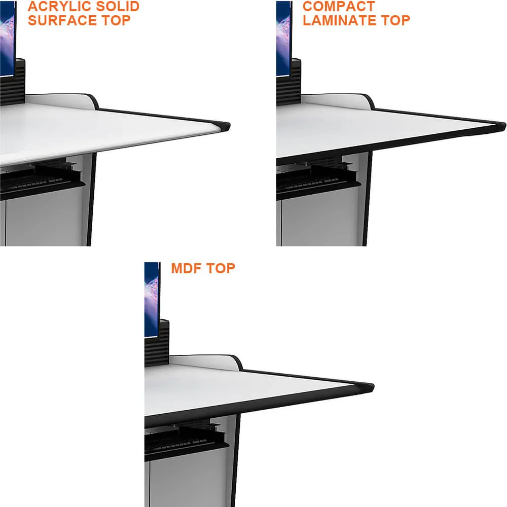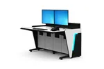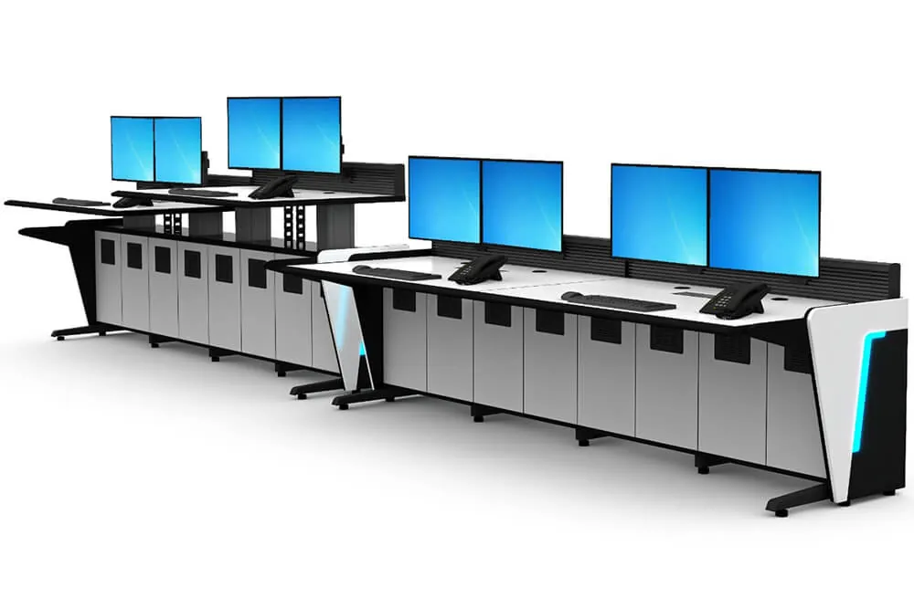 Heavy duty extruded aluminum structure ensures longevity and reliability, while integrated cabinets with ventilated doors ensure ample storage space for accommodating multiple pieces of equipment required for fully operational command consoles.