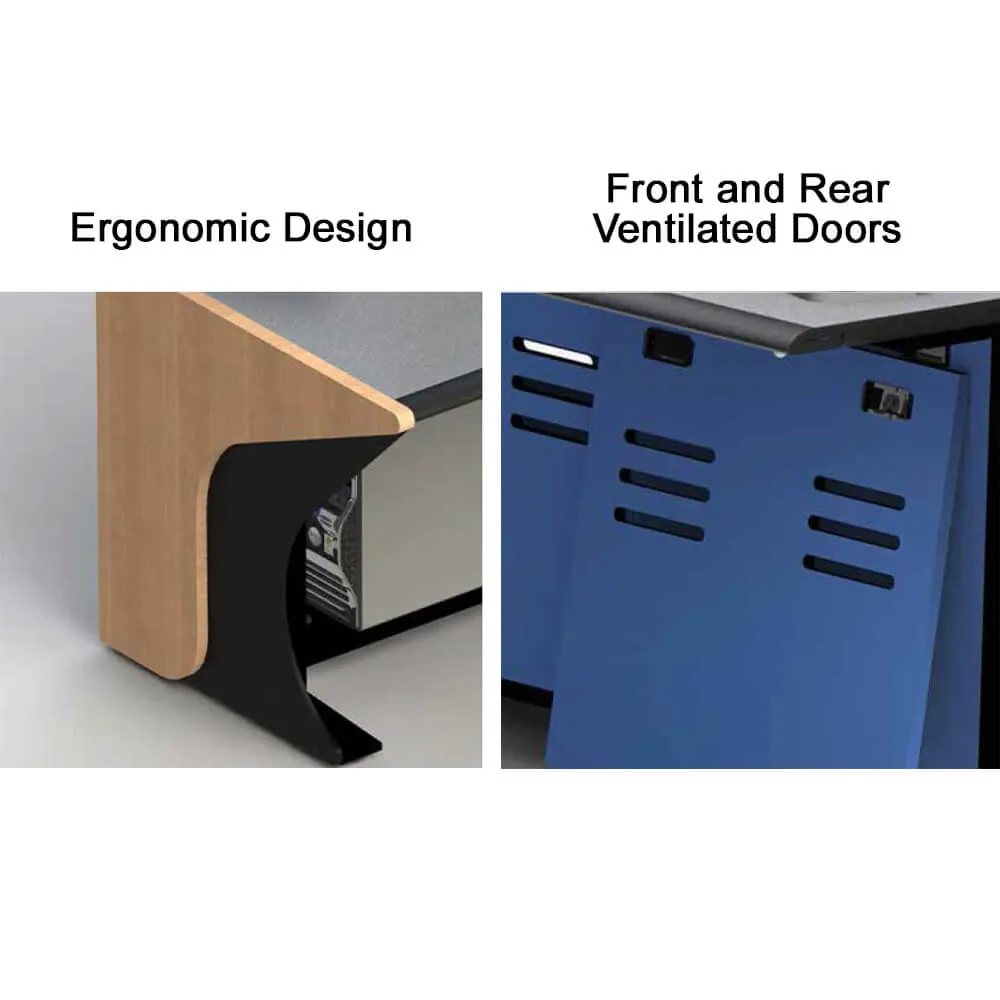 Ventilated front and rear doors lift off for easy access to internal equipment storage area. Doors constructed of ¾ high pressure laminate with MDF cores with built-in lock ability.