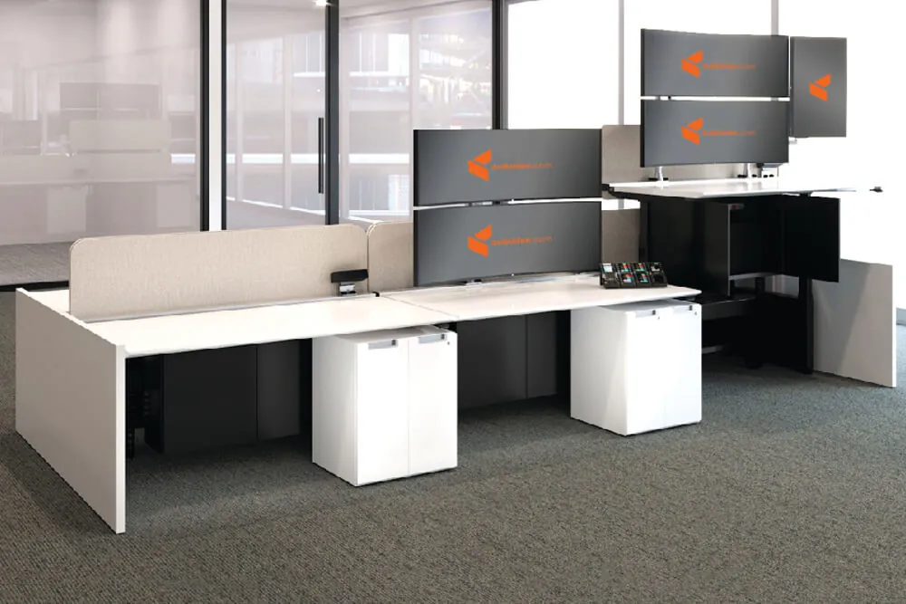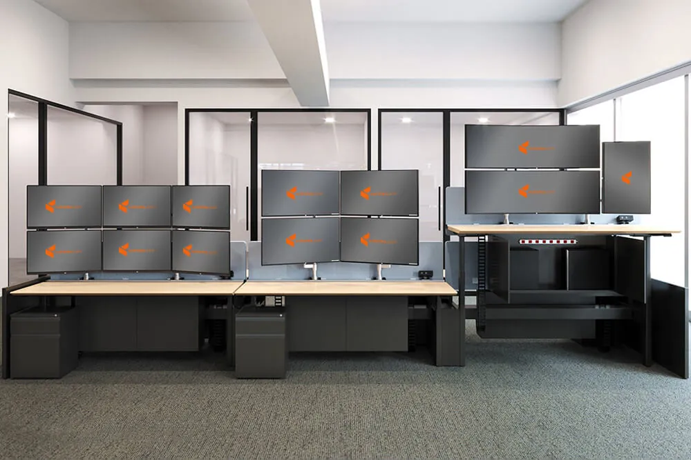 Power, data & IT accommodations tailored within an elegant standalone sit-stand base of Max Range height adjustable desking system promotes ease of use and enhanced user comfort and versatility. Its user ergonomics, logistics and technology combined by design make this trading desk capable of meeting not only the complex demands of trading rooms but also those of 7x24 emergency operation centers, network operations centers, control rooms, and command rooms.
