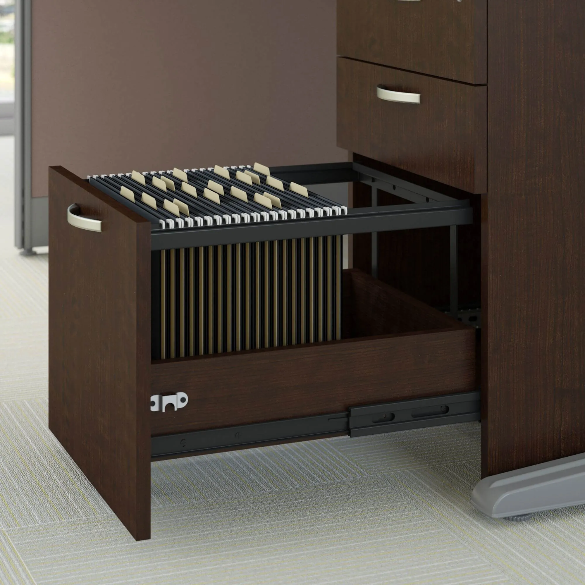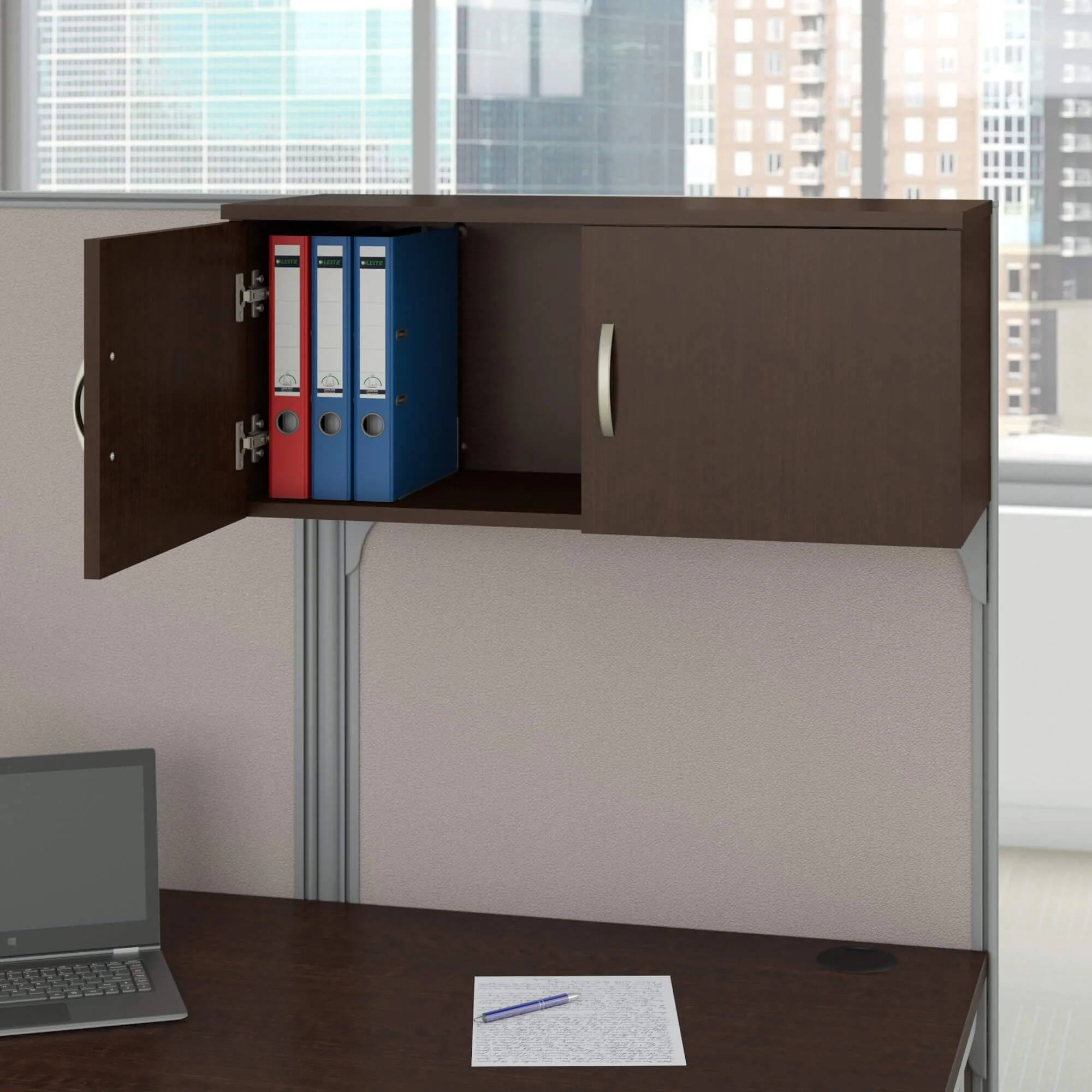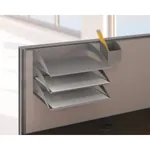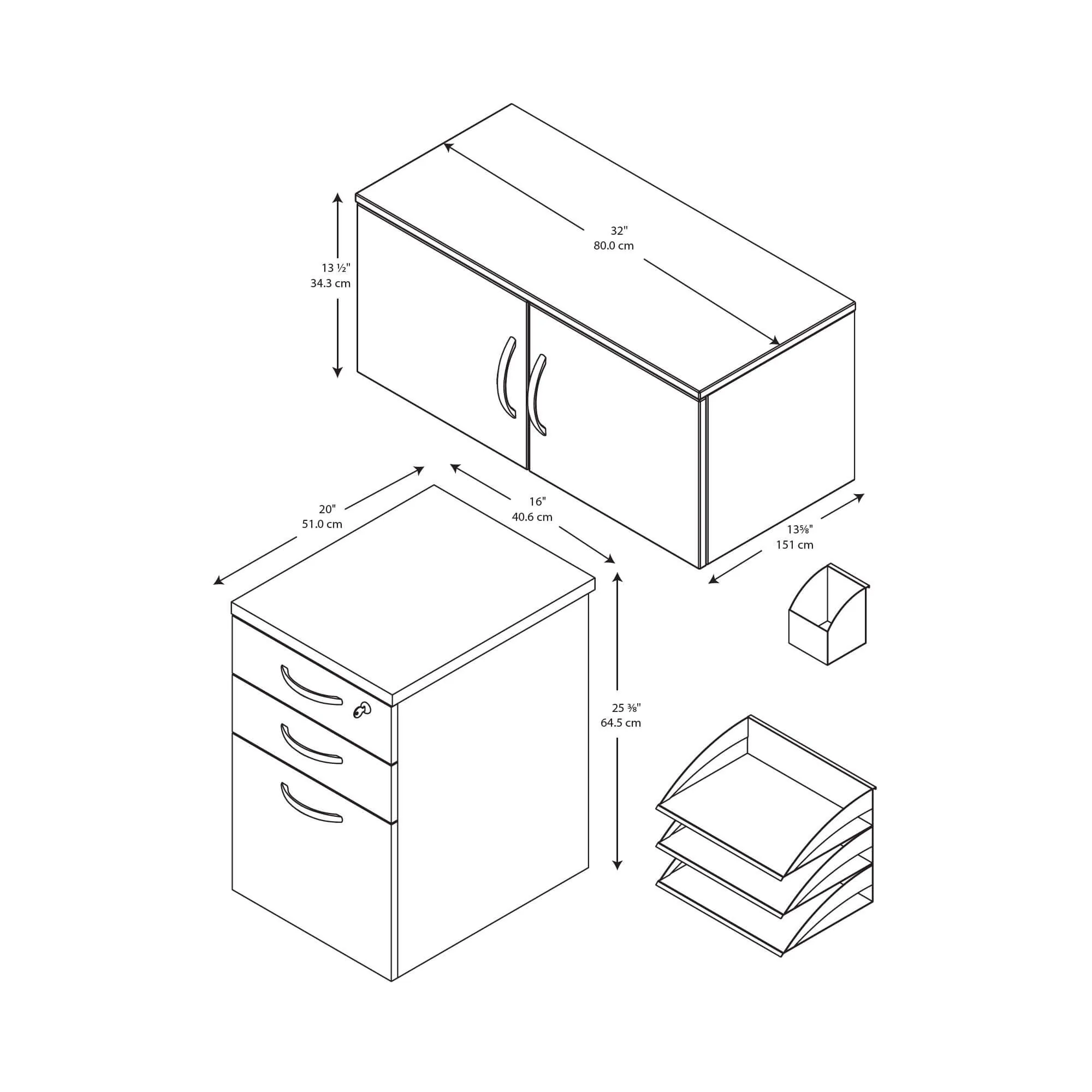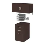 The office cubical storage / accessory kit designed for this collection includes an overhead cabinet with doors, a top locking 3-drawer mobile file pedestal, and paper/pencil storage trays that hang on the cubicle panel wall. Both the storage cabinet and file pedestal ship pre-assembled. Talk about easy office furniture! Keep your workspace neat and organized by hiding the clutter. Items not sold separately.