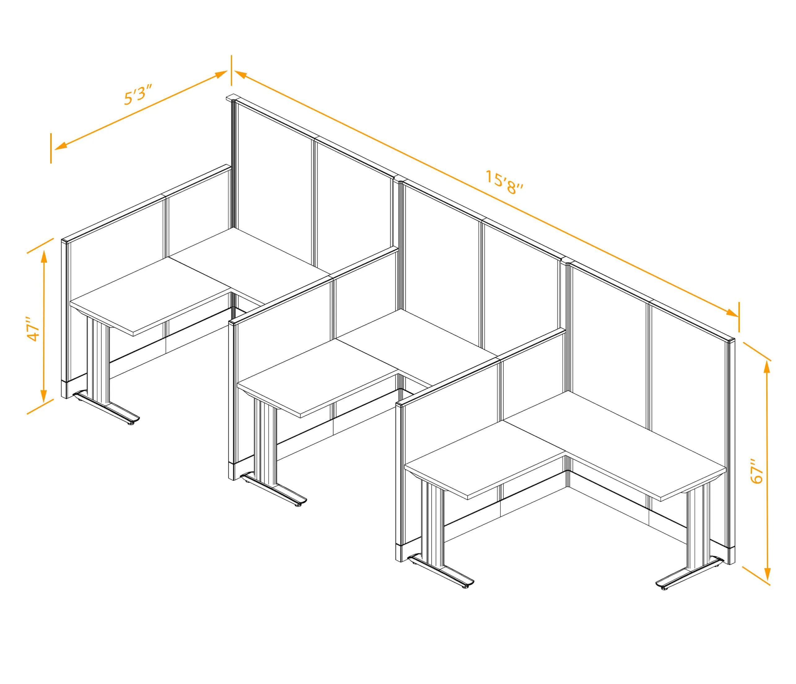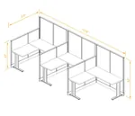 This configuration includes three L-shaped workstations (in a row) surrounded by 47'H and 67”H cubicle walls partitions for solitude as indicated.