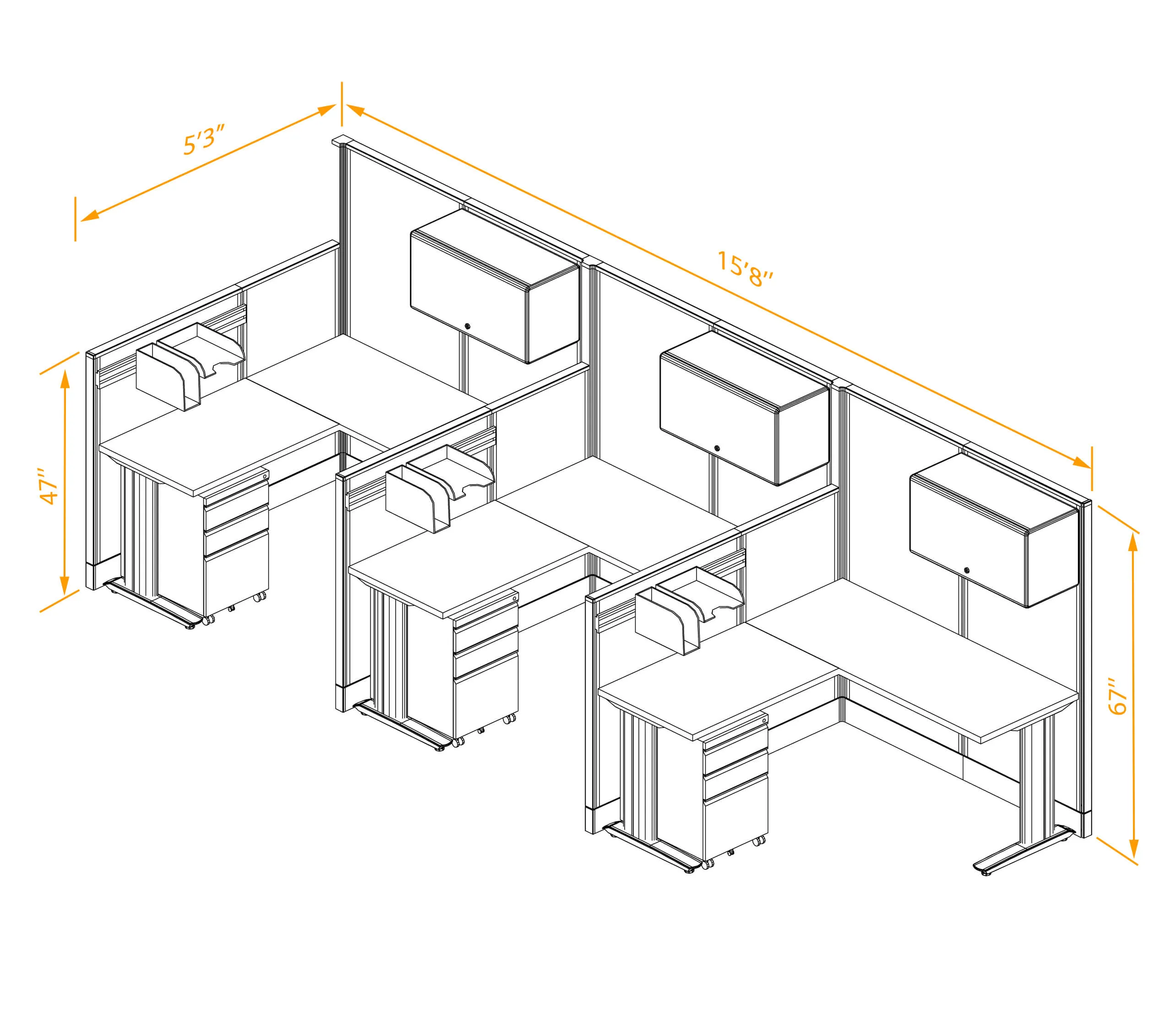 This configuration includes three L-shaped workstations (in a row) with storage, surrounded by 47'H and 67”H cubicle walls partitions for solitude as indicated.