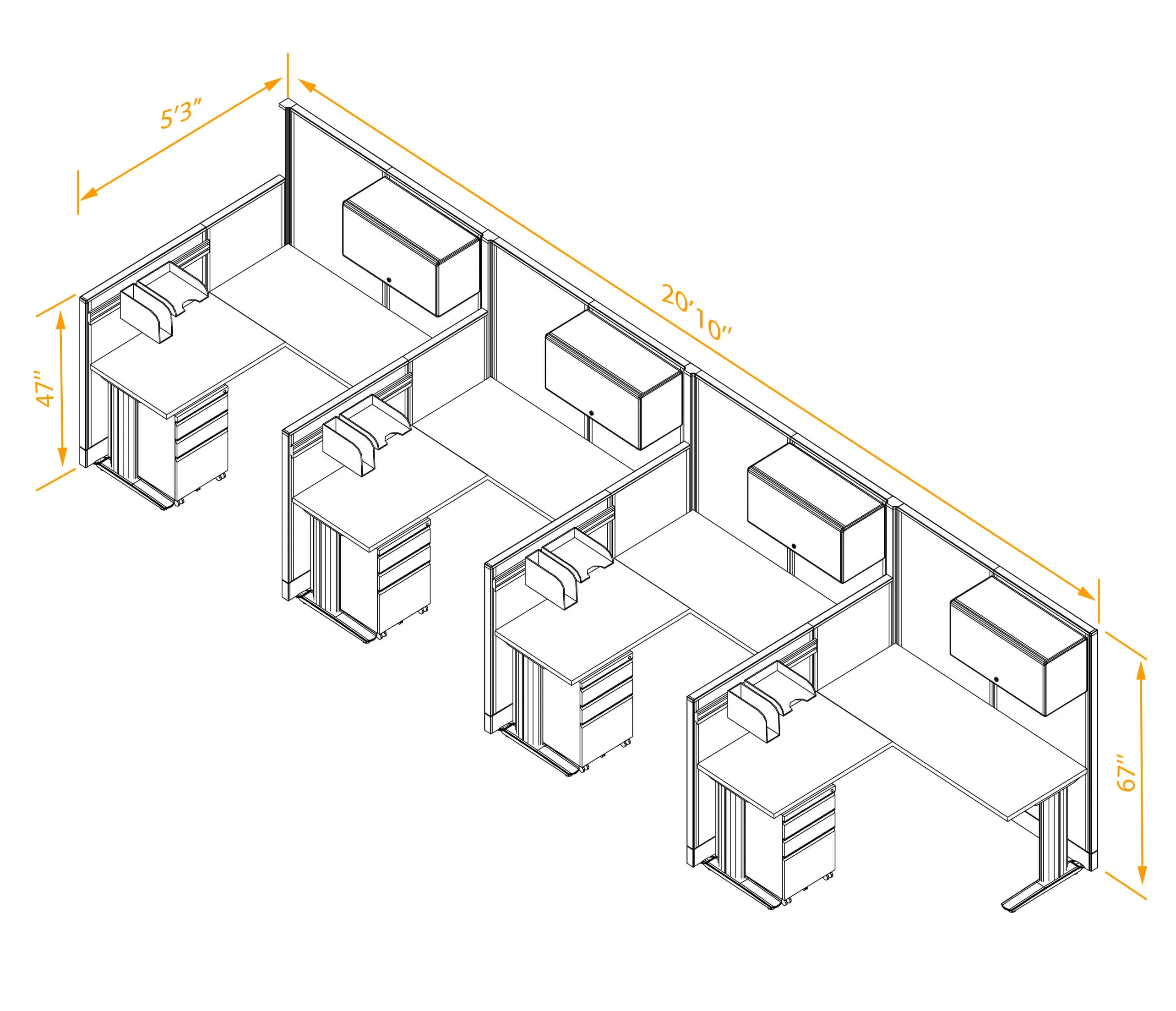 This configuration includes four L-shaped workstations (in a row) with storage, surrounded by 47'H and 67”H cubicle walls partitions for solitude as indicated.