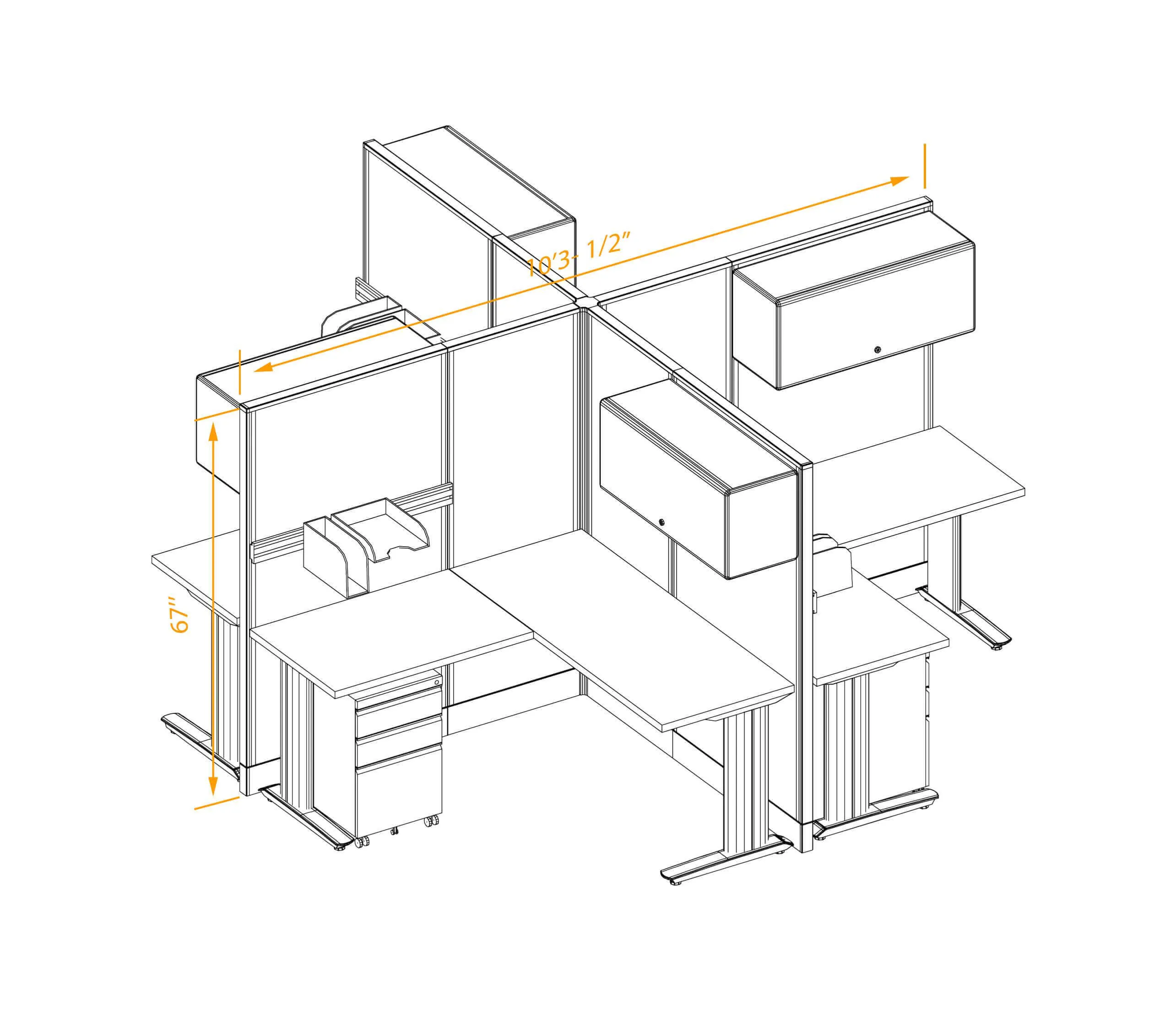 This configuration includes 4 L-shaped workstations with storage, surrounded by 67”H cubicle walls partitions for solitude as indicated.