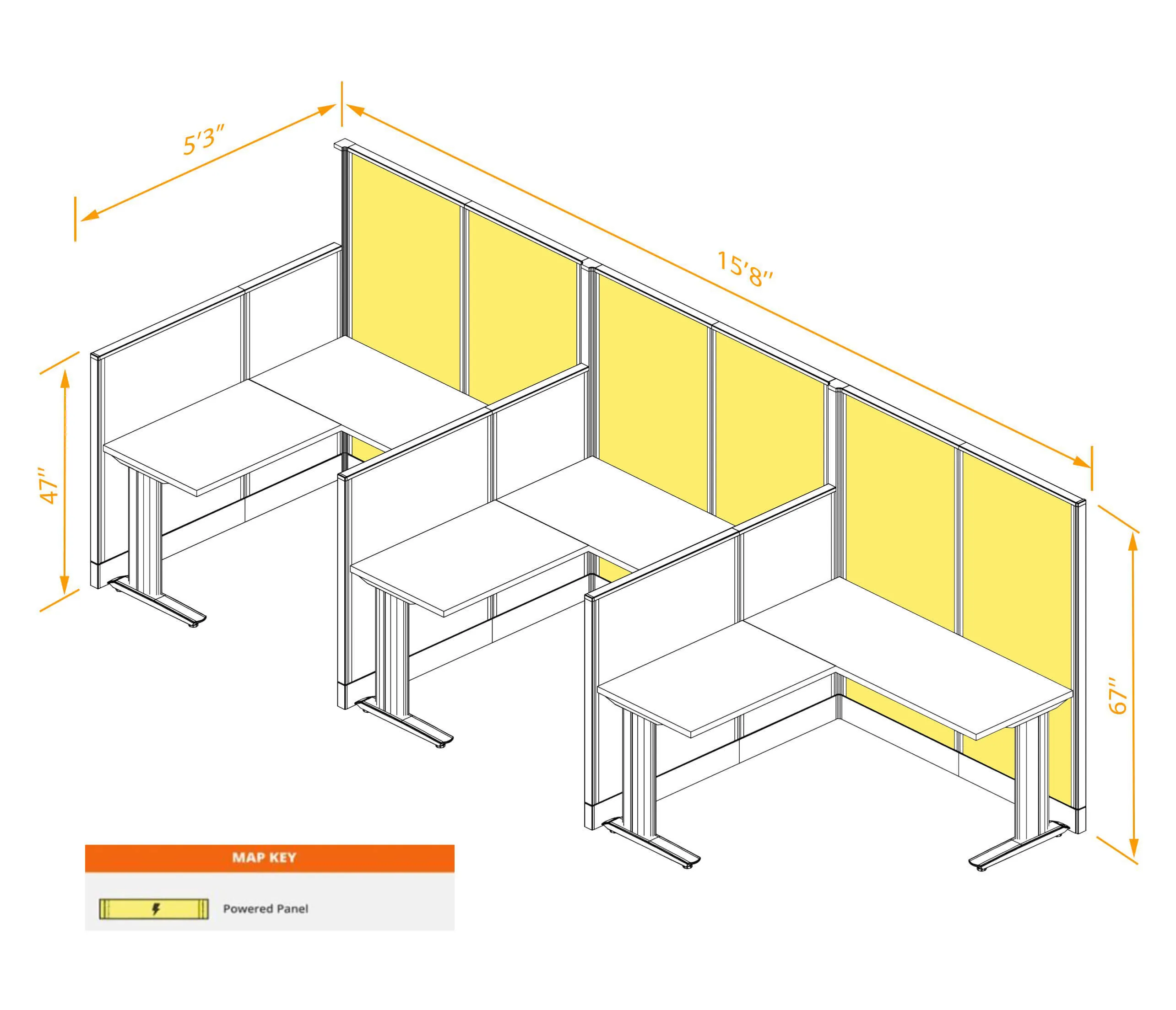 This configuration includes 3 L-shaped workstations (in a row) surrounded by 47'H and 67”H cubicle walls partitions for solitude as indicated.