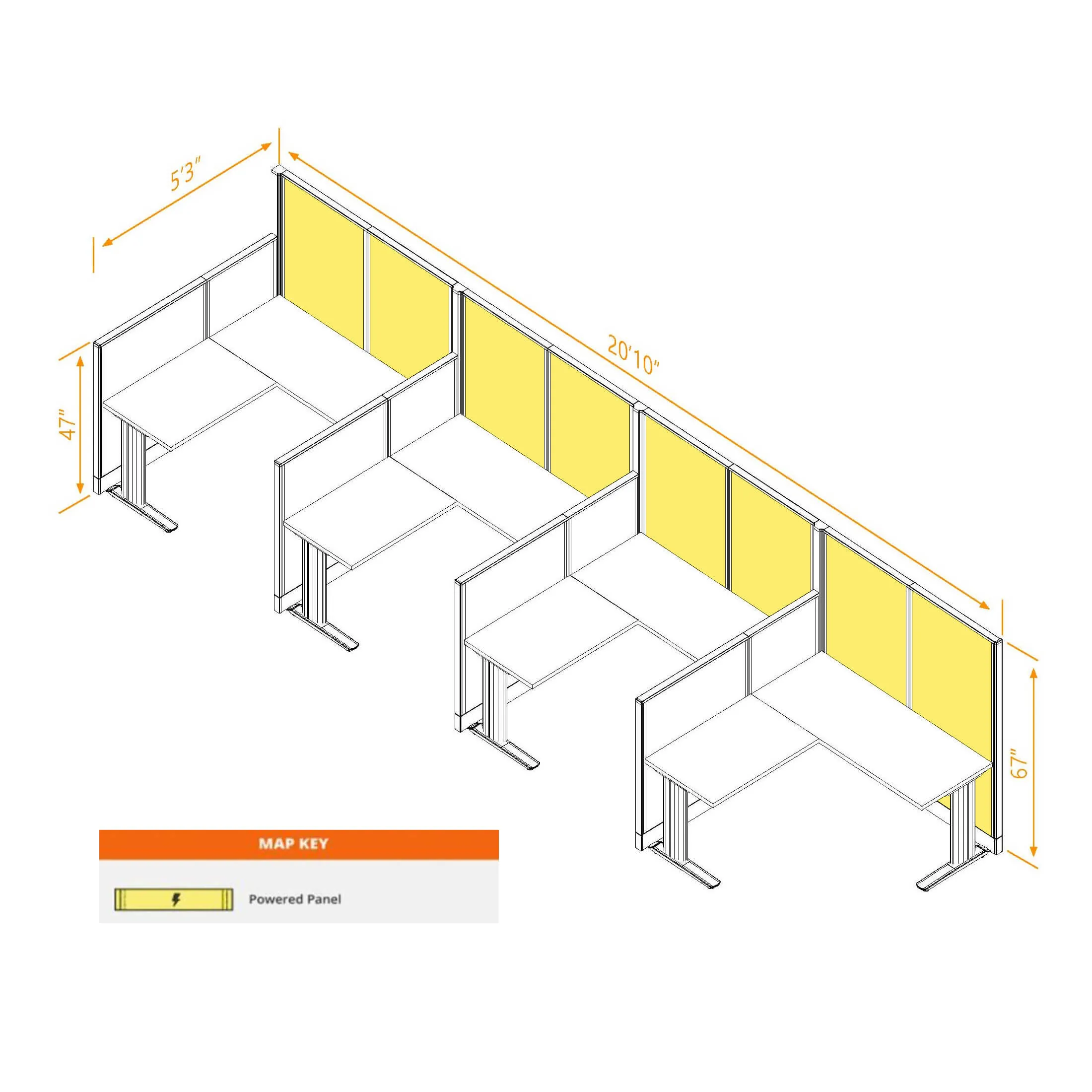 This configuration includes 4 L-shaped workstations (in a row) surrounded by 47'H and 67”H cubicle walls partitions for solitude as indicated.