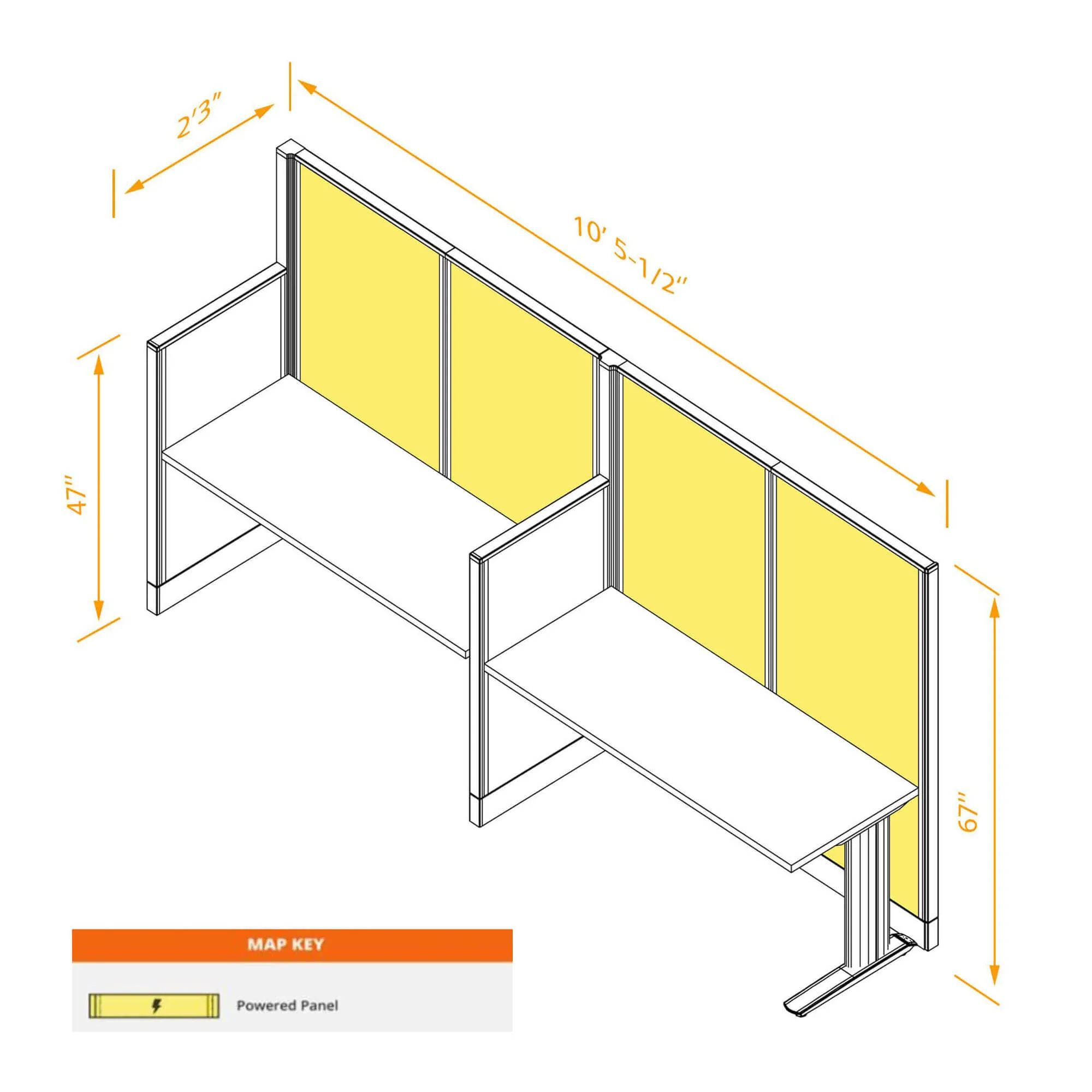 This configuration includes 2 linear workstations (in a row) surrounded by 47'H and 67”H cubicle walls partitions for solitude as indicated.