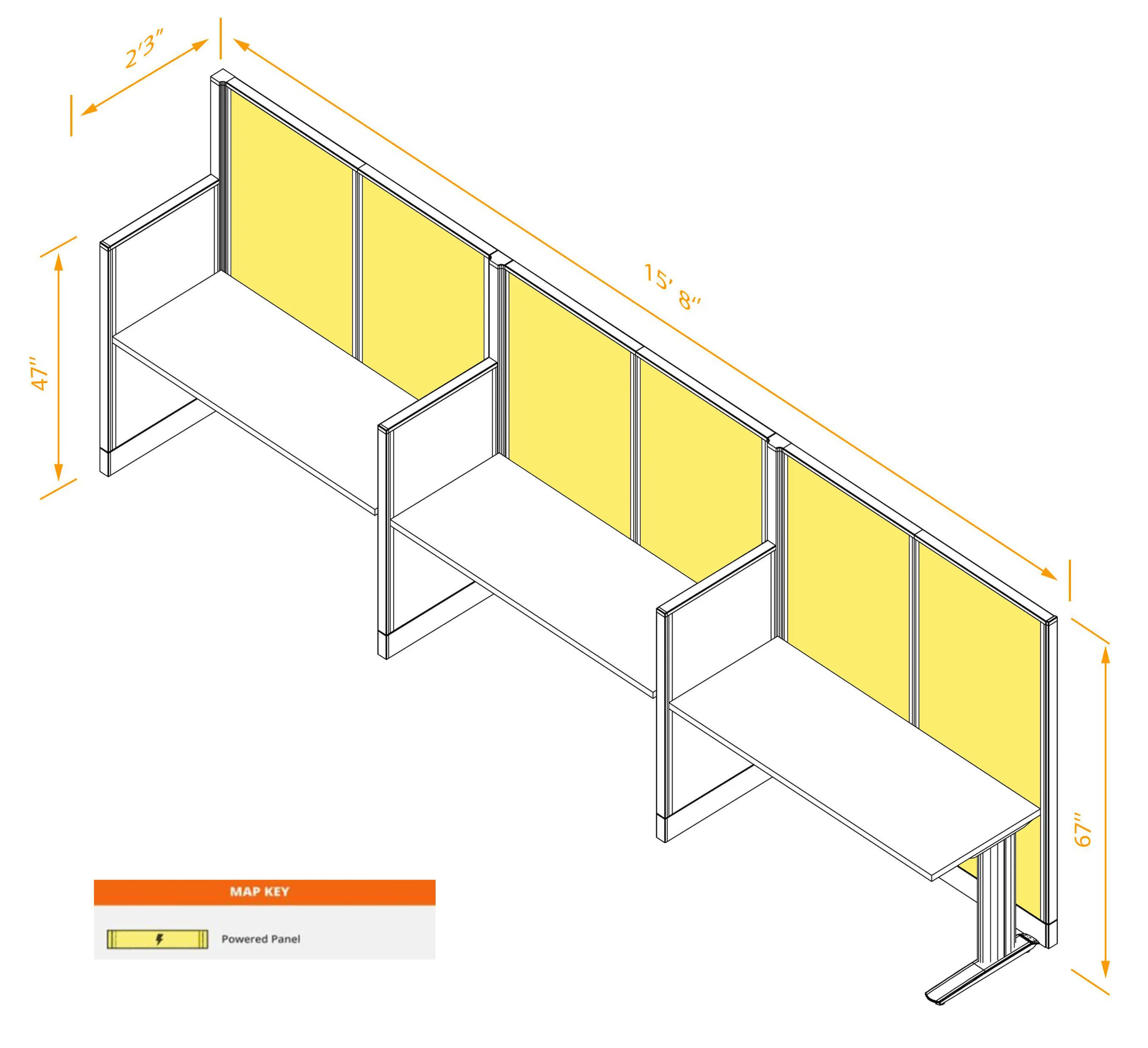 This configuration includes 3 linear workstations (in a row) surrounded by 47'H and 67”H cubicle walls partitions for solitude as indicated.