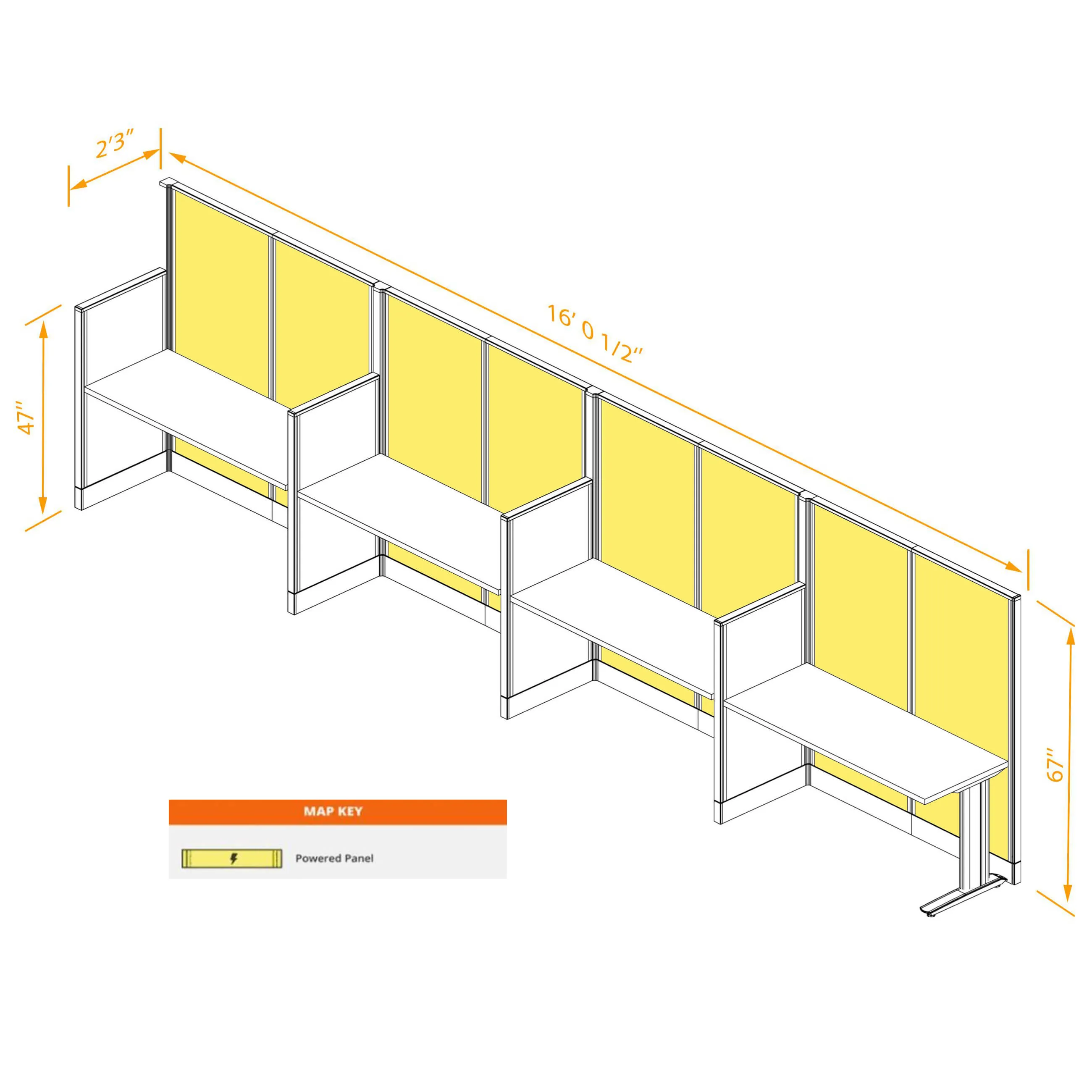 This configuration includes 4 linear workstations (in a row) surrounded by 47'H and 67”H cubicle walls partitions for solitude as indicated.