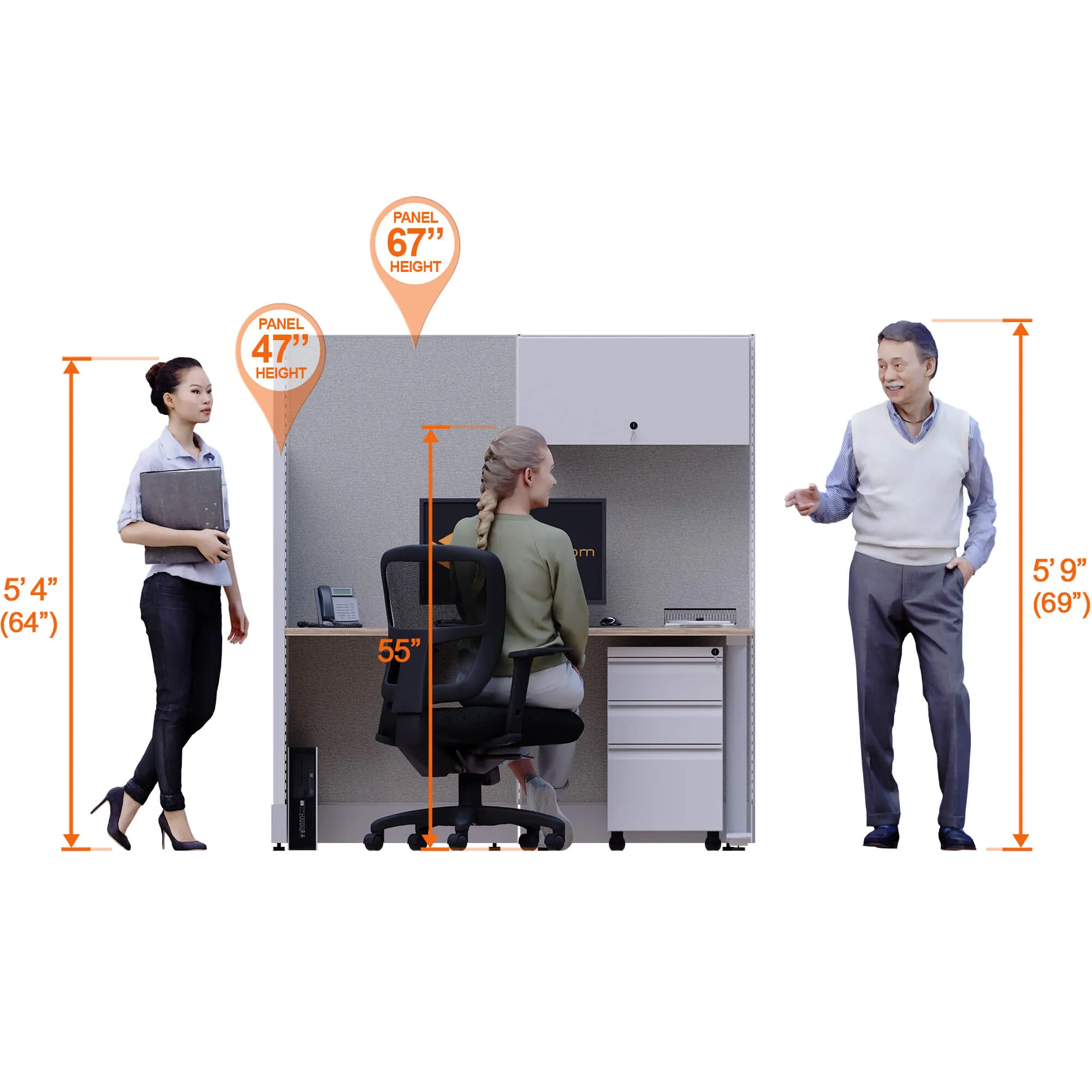 The majority of this collection's cubicles have in themselves two heights panels: 47" and 67", except for the X Cluster version which has all its panels 67" height.